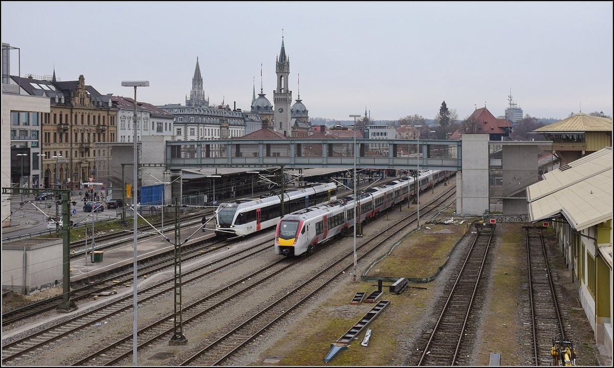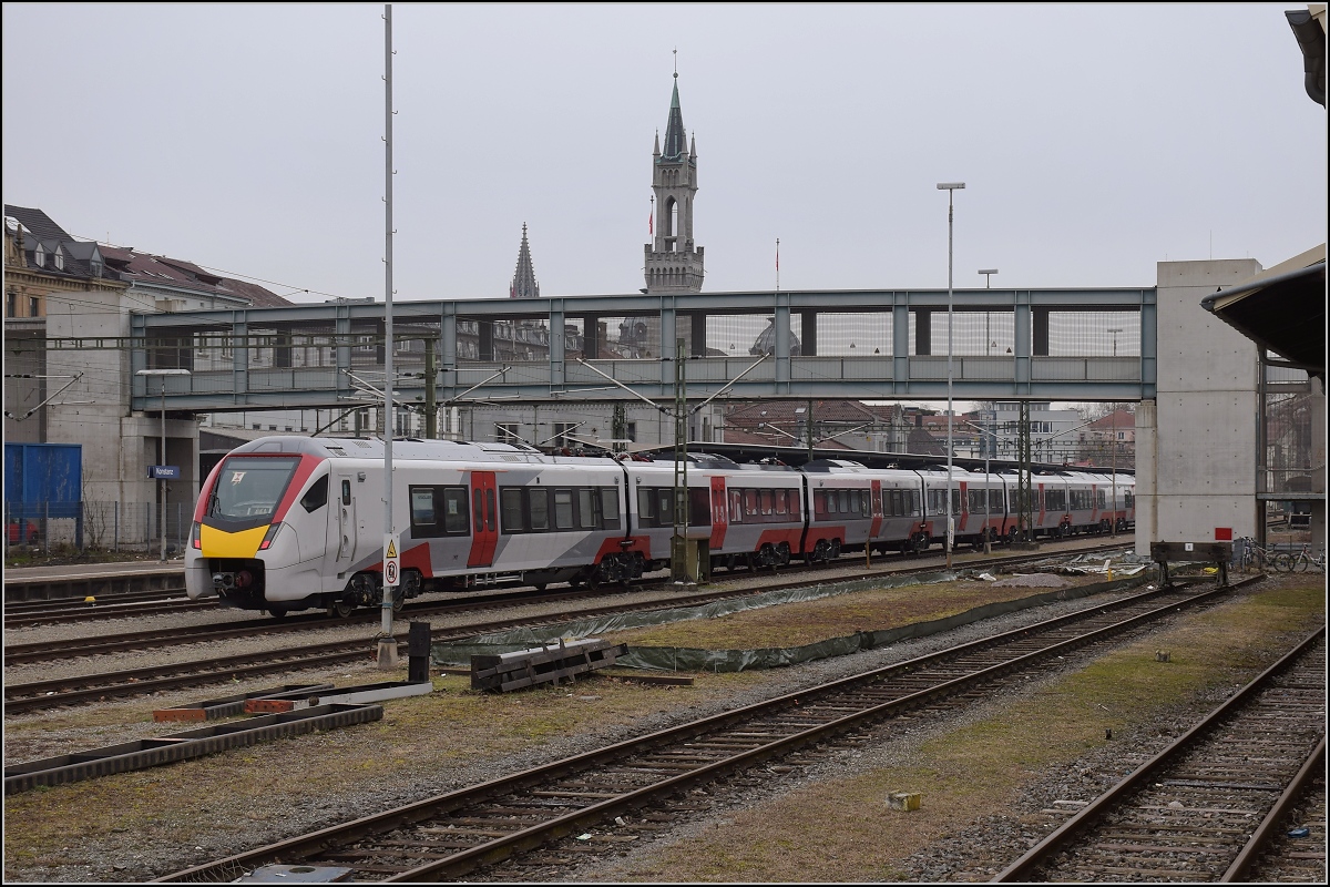 Class 745, Überführungsfahrt des neuen elektrischen Flirt UK beim ersten Stopp in Konstanz. Endwagen 94 70 0 312 102-9. Je zwei mit Jakobsdrehgestell verbunden Teilwagen sind zu 6 Einheiten verbunden. Daraus wird der längste Flirt mit 240 m Länge und 375 t Gewicht. Konstanz, Februar 2018.
