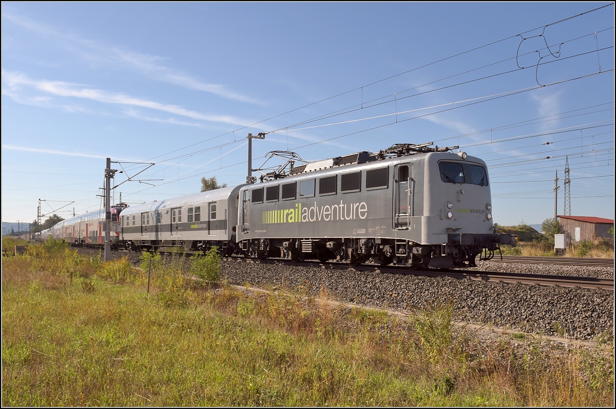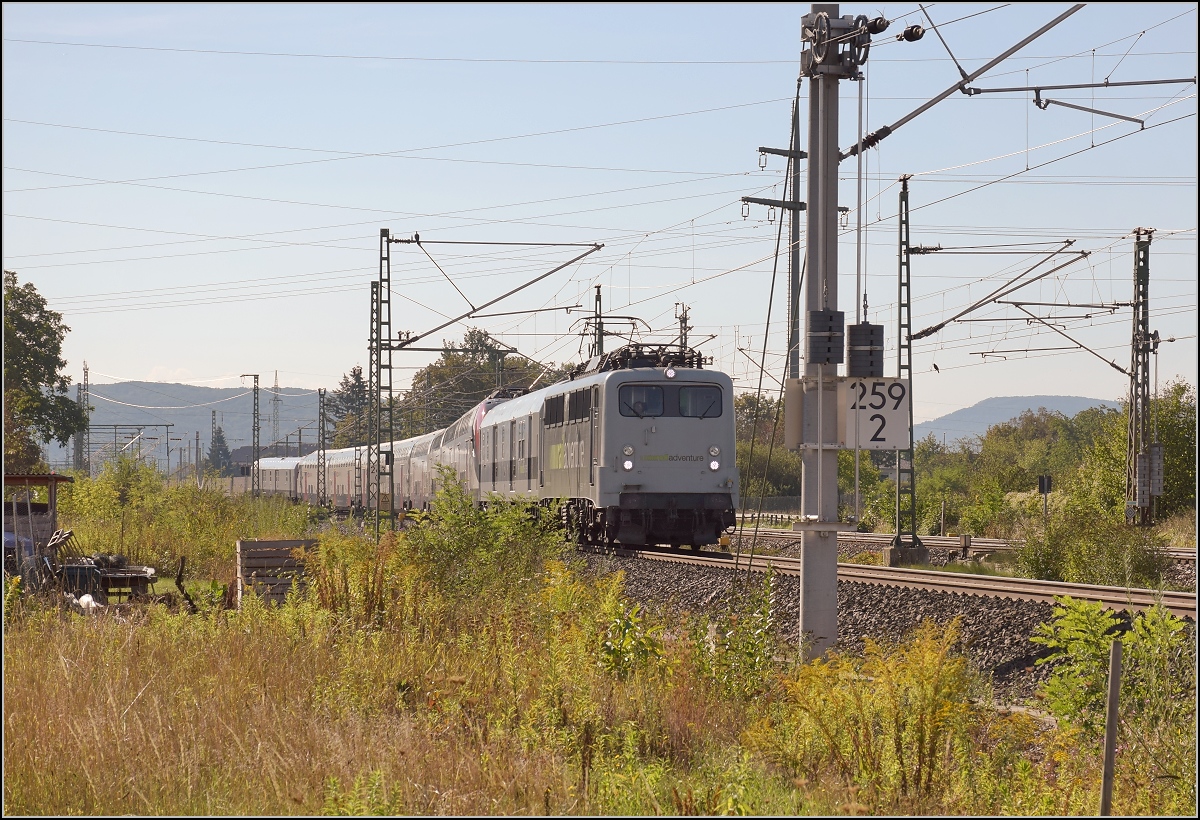 Ein ganz typischer Schwarzwaldbahnzug. Schnellzugwagen vom Typ Bm und vier 8-türigen Eilzugwagen. Ich vermute, der Kurswagen aus Paris hatte es hier nicht rechtzeitig hinter die Lok geschafft, so ist er oder die beiden am Zugschluss zu sehen.