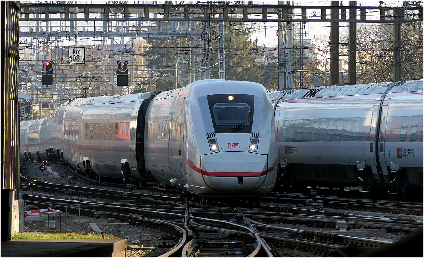 Draußen auf dem Lorraineviadukt taucht rechts neben dem ICE ein Hochgeschwindigkeitszug der Baureihe RABe 503 auf und fährt langsam mit einer Linksdrehung des Steuerwagen, während sich jetzt auch der ICE 4 in Bewegung setzt und einen leichten Buckel macht. Der Güterzug hat für seine Einfahrt jetzt Platz gemacht.