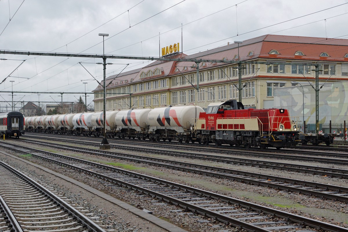 Hohenzollerische Landesbahn AG (HzL) V 181 mit Holcim-Ölschiefer-Züge am25.03.2017 bei Welschingen-Neuhausen