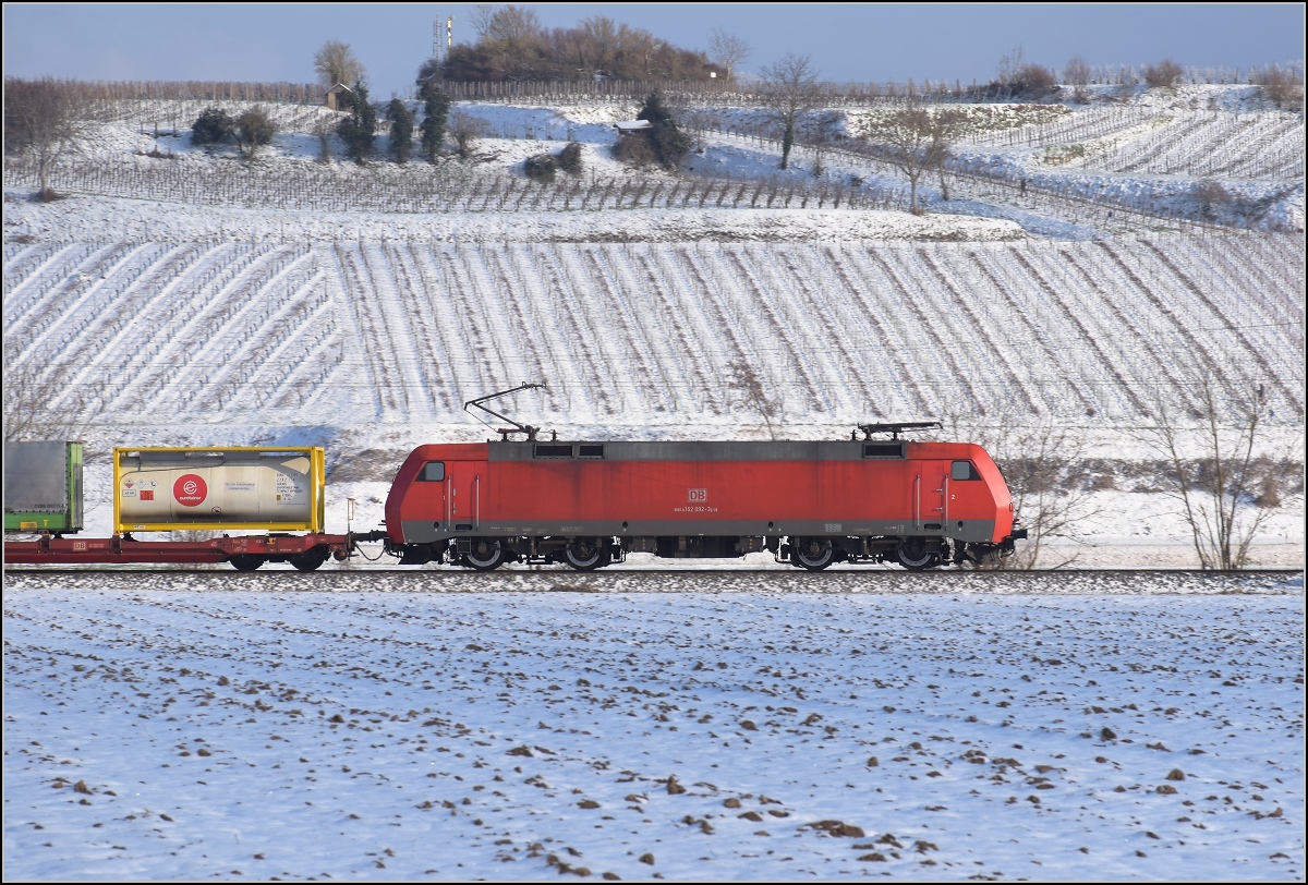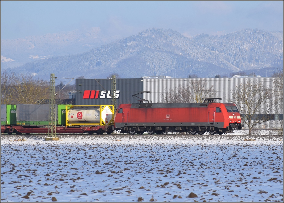 Die 152 087-3 (91 80 6152 087-3 D-DB) der DB Cargo AG fährt am 21.01.2023 mit einem Ethylendichlorid (Gefahrgut-Nr. 336/1184) beladenen Kesselwagenzug durch Niederschelden (Sieg) in Richtung Siegen.