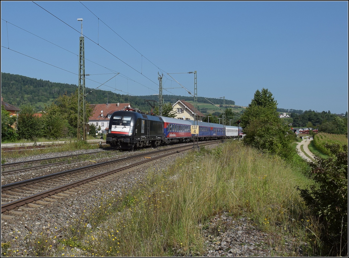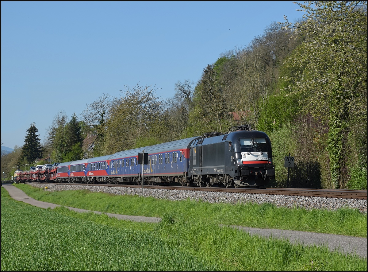 Der Autozug nach Lörrach kam recht spät eingetrudelt. Hier gezogen vom Ochsen 182 512 der MRCE. Im Hintergrund der Hohenhewen, mit 848 m der höchste Hegauvulkan.