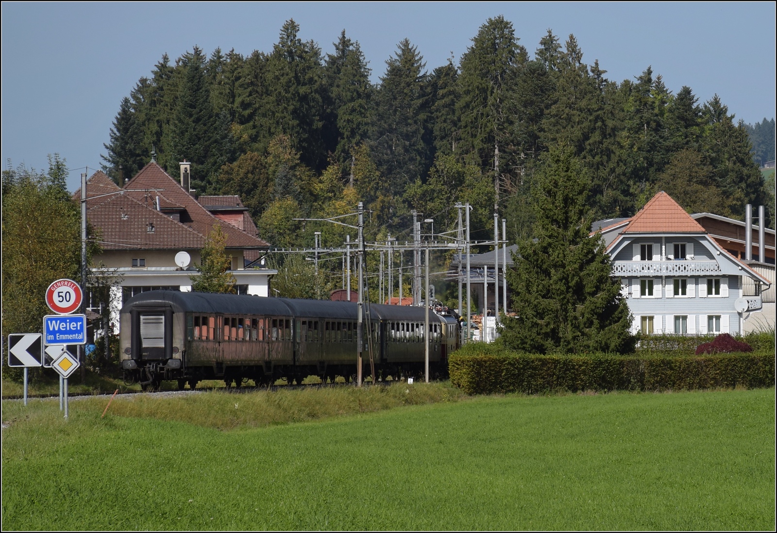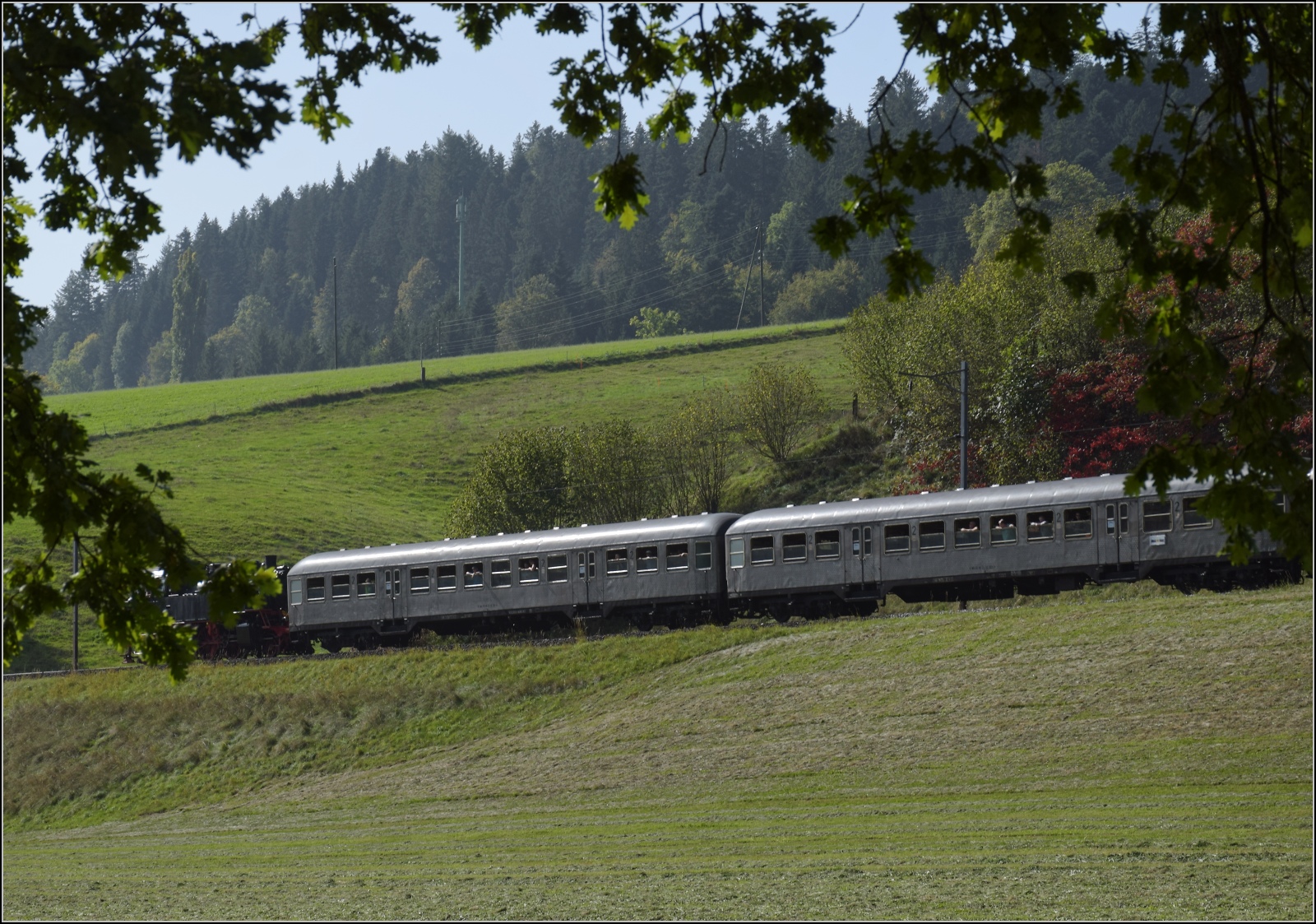 Der Silberling (n-Wagen) der DB hört auf D-WFL 55 60 22-50 001-8, dahinter D-WFL 55 60 22-50 005-9. Beide Wagen sind bereits von der Wedler-Franz-Logistik in den Besitz der Eurovapor übergegangen. Sumiswald-Grünen. Oktober 2023.