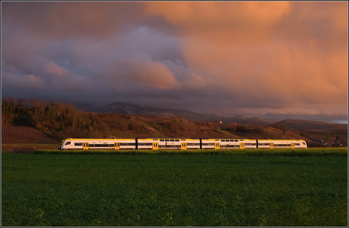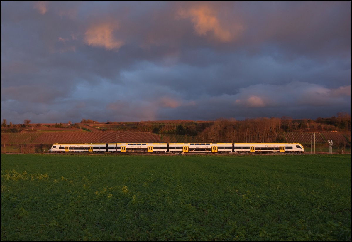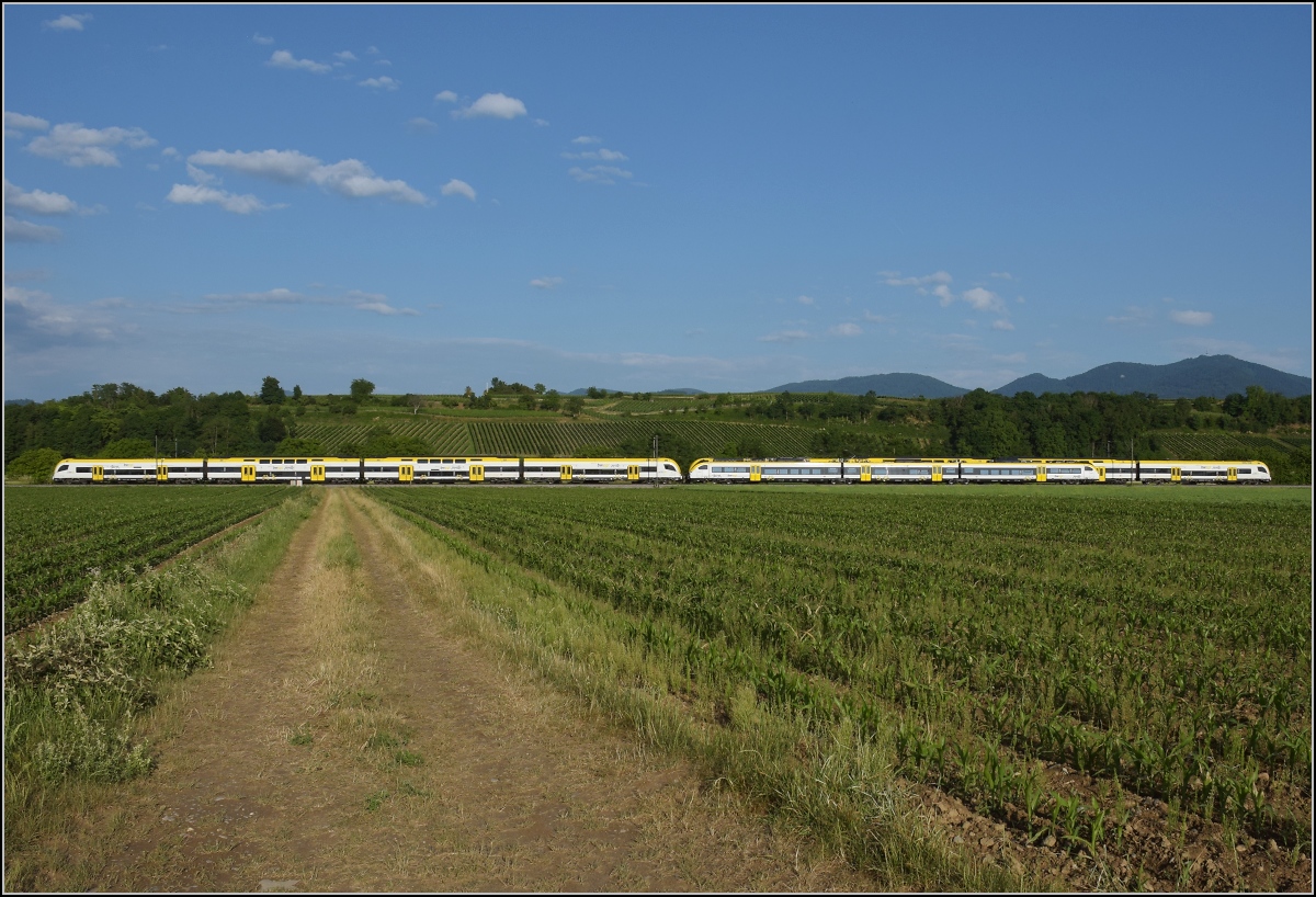 Ein Neuer, auch wenn er die Schweiz nur streift: 94 80 1 462 002-5 D-DB, manche nennen den Desiro HC auch Kamel. Hier auf dem Rückweg von Basel nach Freiburg. Zwischen Schliengen und Auggen ergibt sich dieser freie Blick auf die Strecke. Mai 2020.