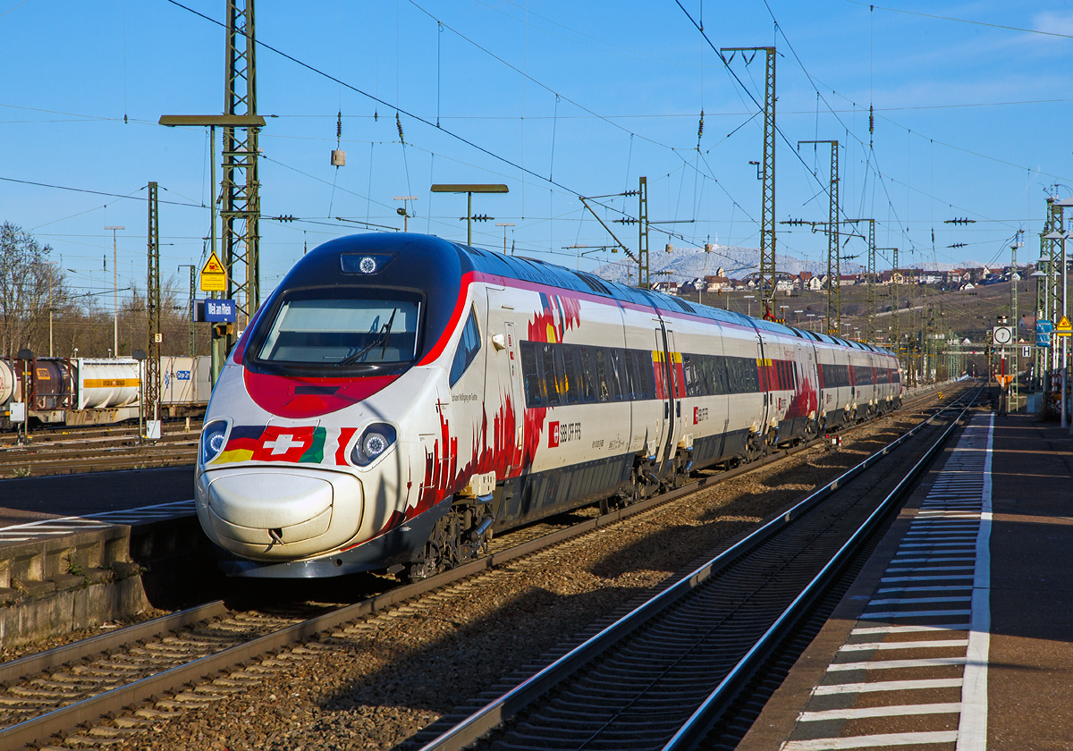 Der SBB RABe 503 022 „Johann Wolfgang von Goethe“  (NVR-Nr. 93 85 0 503 022-2 CH-SBB) im Drei-Länder-Design bzw. Drei-Bahnen- Design (SBB / DB / FS) fährt am 29.12.2017, als ECE 151 (Frankfurt - Basel – Lugano – Mailand), durch den Bahnhof Weil am Rhein in Richtung Basel. Weit im Hintergrund der schneebedeckte Feldberg.