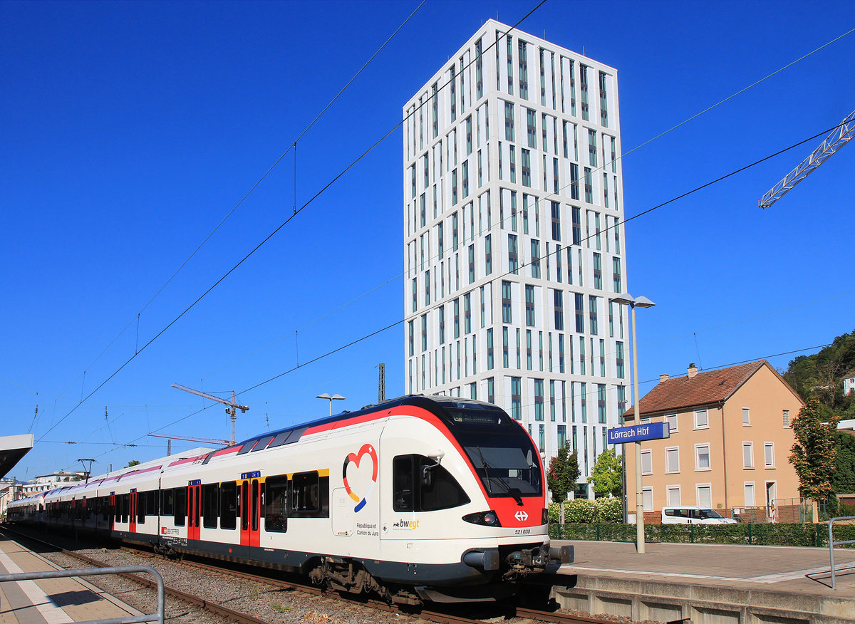 Nahaufnahme - République et Canton du Jura in Deutschland. Triebzug 521 030 in Lörrach, vor dem neusten Hotel dieses Städtchens. 20.August 2020