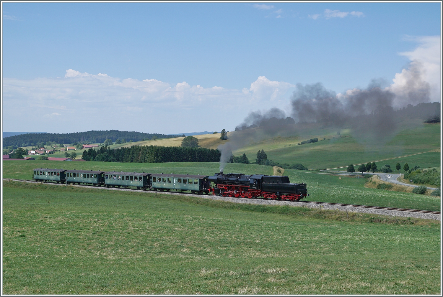 30 ANS CONI'FER /30 Jahre Coni'Fer - Der Stolz der Coni'Fer: die mächtige 52 8163-9. Da die Lok für die relativ kurze Strecke ziemlich gross ist und anscheinend recht viel Brennstoff (Holz) verbraucht, ist die herrliche Dampflok nur zu besonderen Anlässen im Einsatz; und das 30 Jahre Jubiläum ist natürlich ein solcher Anlass. Das Bild entstand im frei zugänglichen Museumsgelände der Coni'Fer in Les Hôpitaux Neufs.