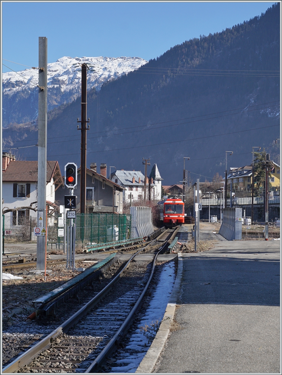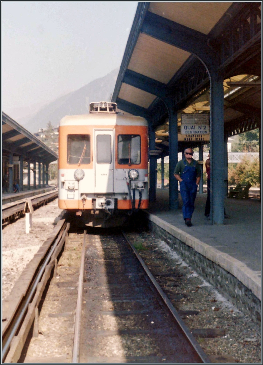 Der SNCF BDeh 4/8 801/804 (94 87 0000 804-8 F-SNCF) wartet in Chamonix Mont-Blanc auf die Weiterfahrt nach Vallorcine. Neben dem Zug, der (bewusst) durch Bahnsteigdachmasten verdeckt ist, sind zahlreiche Details zu sehn wie z.B der Entwerter, Teile der Stromschiene und Warn- und Hinweisschilder.