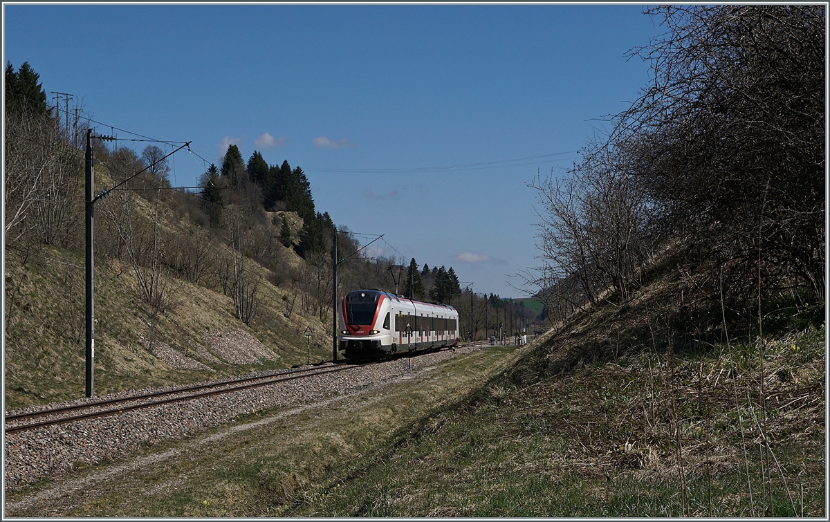 Der SBB RABe 522 207 ist als RE 18124 zwischen Les Verrieres und Pontralier kurz vor La Cluse et Mijoux auf dem Weg von Neuchâtel nach Frasne. 16. April 2022