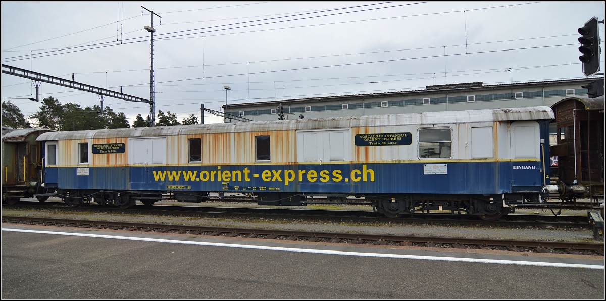 Die letzte Anmeldung zum Orientexpress ist doch schon einige Jahre her. Doch noch immer hängt das Schild am Begleitwagen zum Orientexpress. Sulgen, April 2014.
