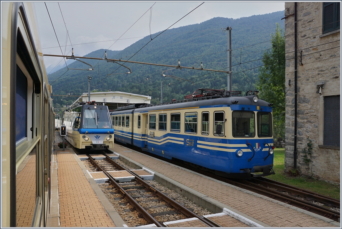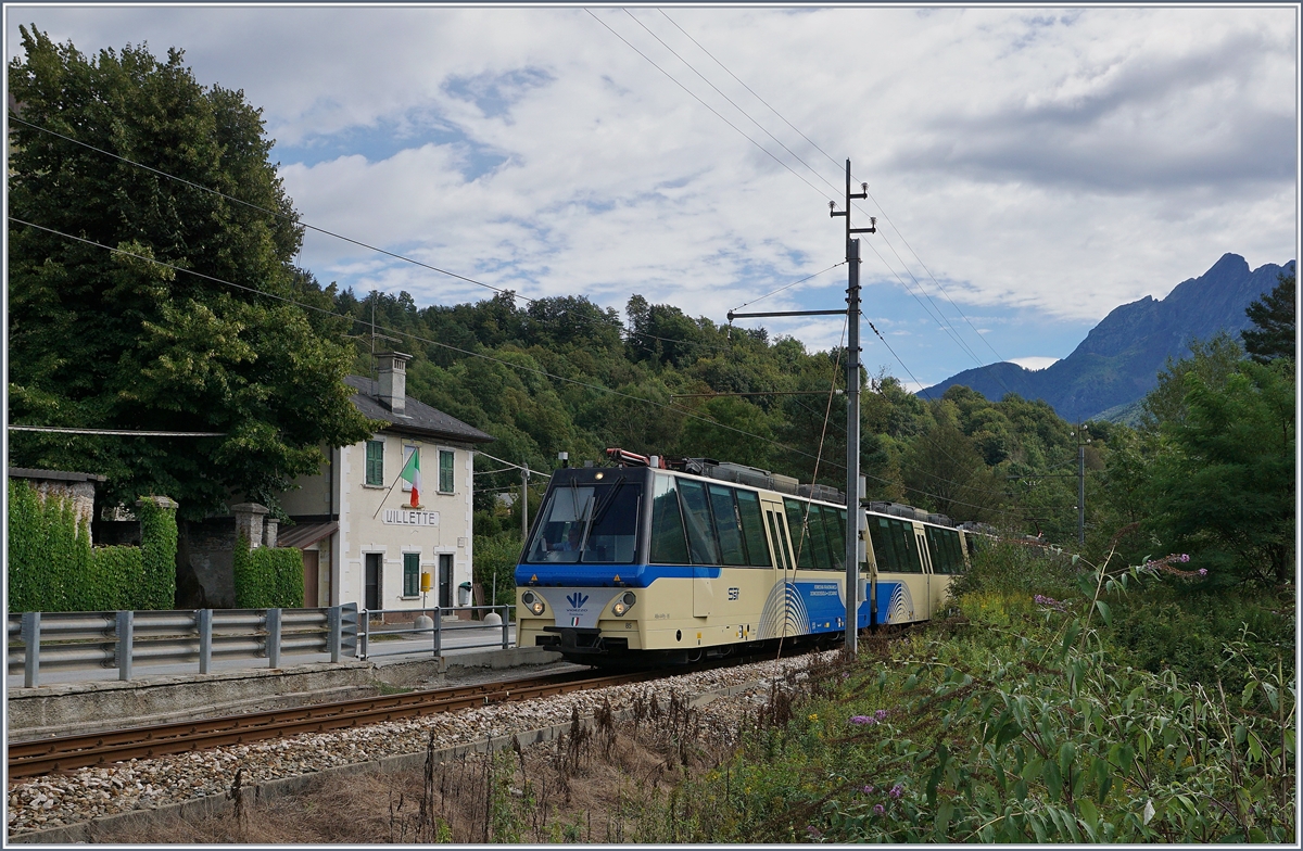 Der SSIF Ferrovia Vigezzina Treno Panoramico D 40 P auf der Fahrt von Locarno nach Domodossola bei der Durchfahrt in Gagnone-Orcesco .