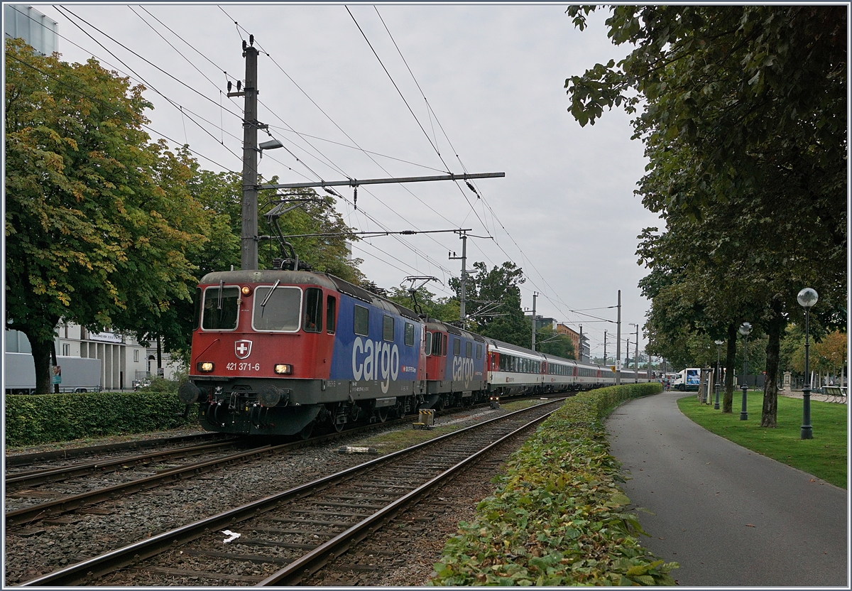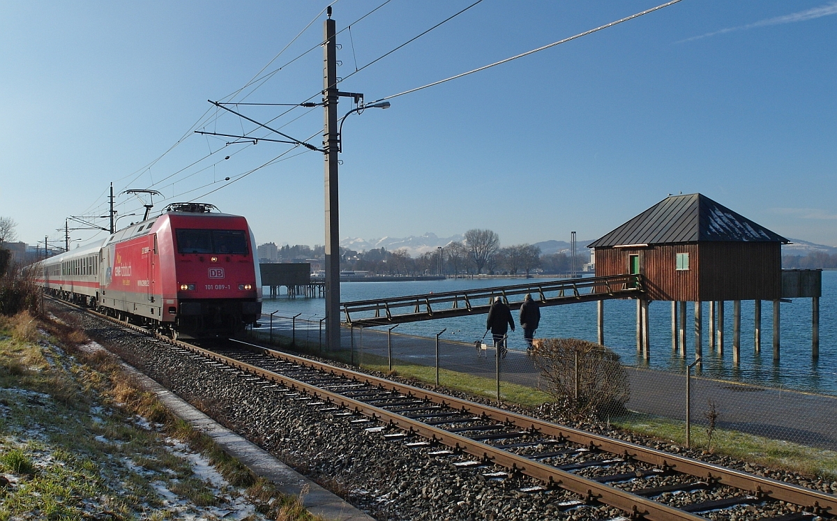 Am Bregenzer Bodenseeufer zieht 1116 250 die Railjet-Wagen von der Bereitstellung im Bahnhof Wolfurt kommend am 11.07.2012 nach Lindau, um dort die Fahrt als RJ 561 nach Wien zu beginnen.