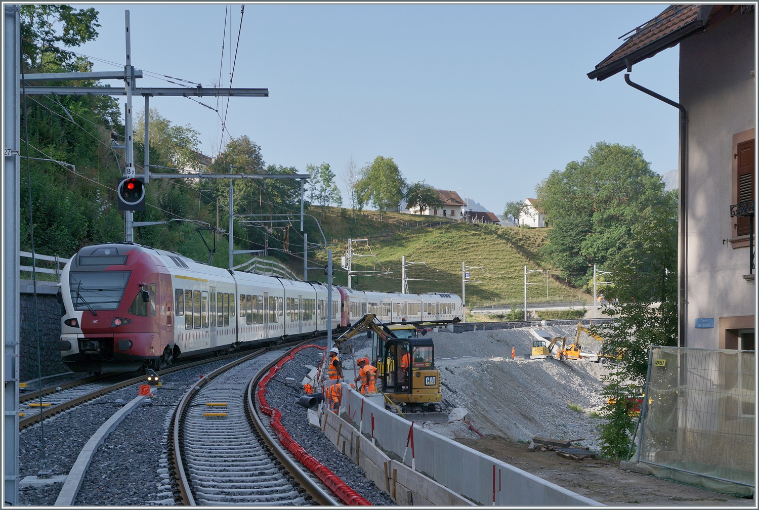 Während der gefällige TPF Flirt RABe 527 198 "Groupe Grisoni" in Bulle endet, fährt der SBB RBDe 560 weiter; wobei sich Bahnhofsanzeige und die Anzeige am Zug nicht ganz einig sind wohin die Fahrt geht. Kleine unstimmige Details in den ersten Tagen nach der Aufnahme des Verkehrs auf der umgespurten Strecken Bulle - Broc VILLAGE.