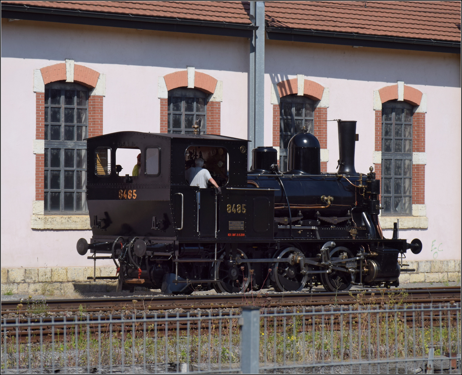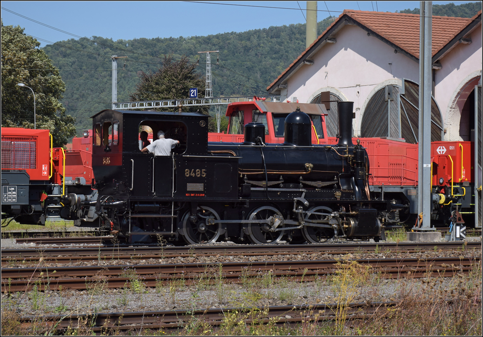 150 Jahre Schweizer Eisenbahn: Die E 2/2 N° 3 "Zephir" verlässt mit zwei RHB Wagen den Bahnsteige des Bahnhof von Delémont in Richtung "Festgelände" bei der Drehscheibe im östlichen Teil des Bahnhofs.