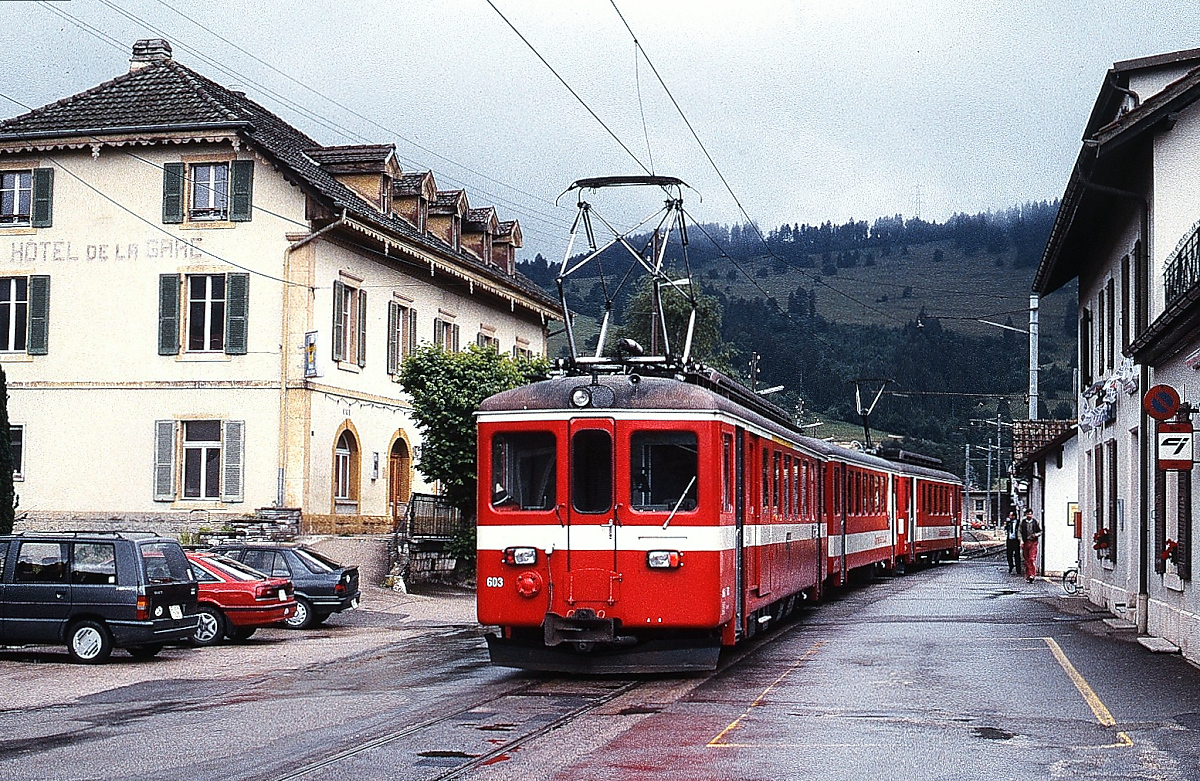 Ziemlich eng ging es auf dem Bahnhofsvorplatz in Glovelier zu: Im Sommer 1997 steht ein CJ-Zug nach La-Chaux-de Fonds, am Zugschluss BDe 4/4 I 603, zwischen dem Hotel de la Gare und dem Bahnhofsgebäude Horst Lüdicke