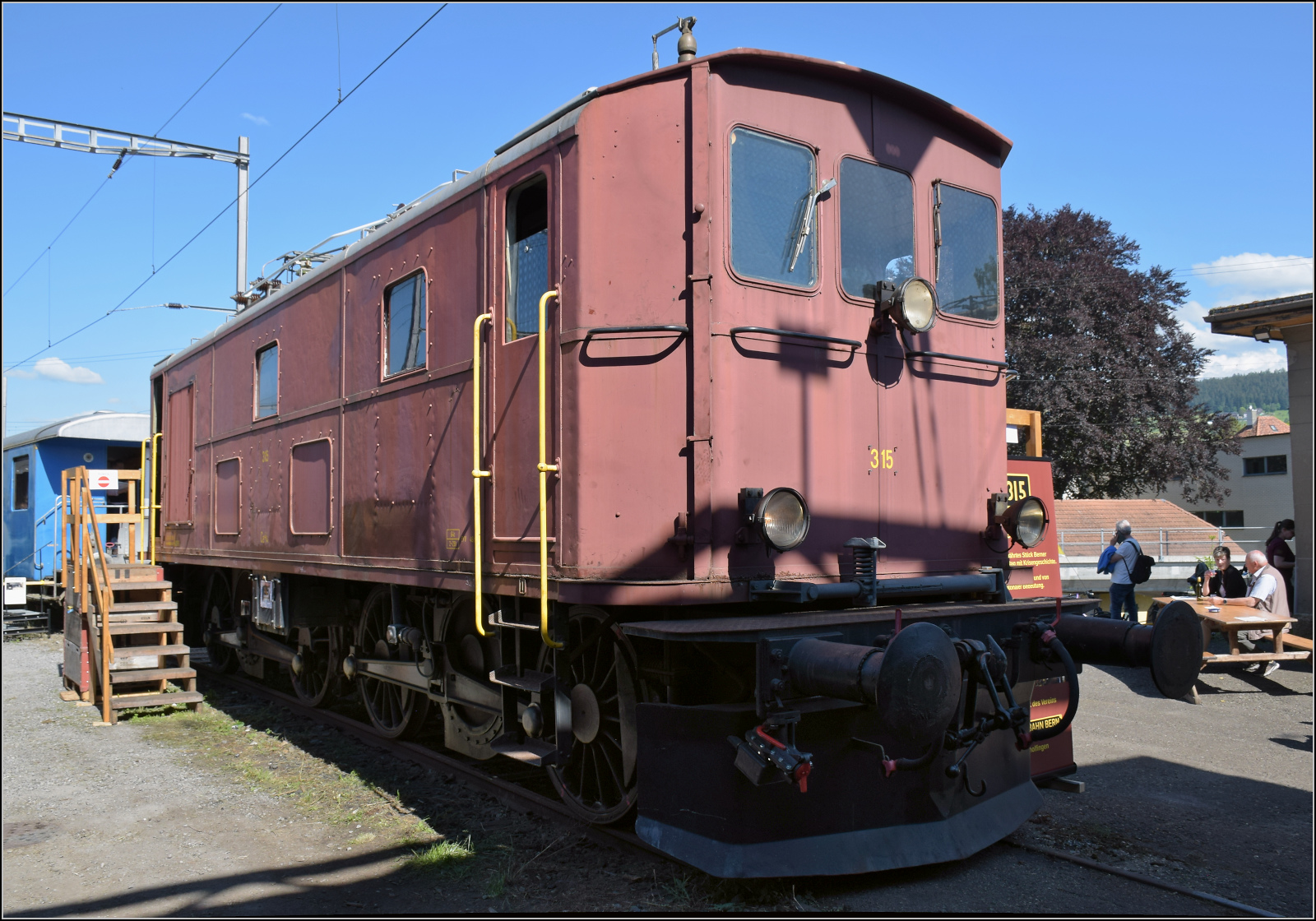 Ce 4/4 315 wurde als Ce 4/6 im Jahr 1922 an die Bern-Neuenburg geliefert. Baulich mit winzigen Vorbauten und mechanisch als kleines Krokodil. Nach Ertüchtigung der Strecken für höhere Achslasten konnten die Laufachsen entfernt werden. Bei dieser Maschine erfolgte der Umbau im Jahr 1956. Konolfingen, Mai 2025. Olli