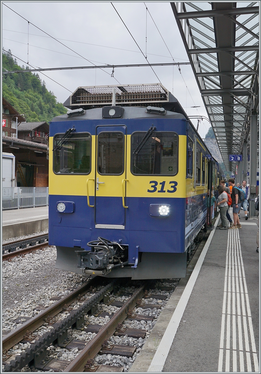 Blick auf den neuen "Wengener"-Pendel Zug in Lauterbrunnen. Wobei leider der eigentlich interessante WAB He(m) 4/4 hier kaum zu sehen ist und auch vor Ort nicht befriedigend zu fotografieren war.