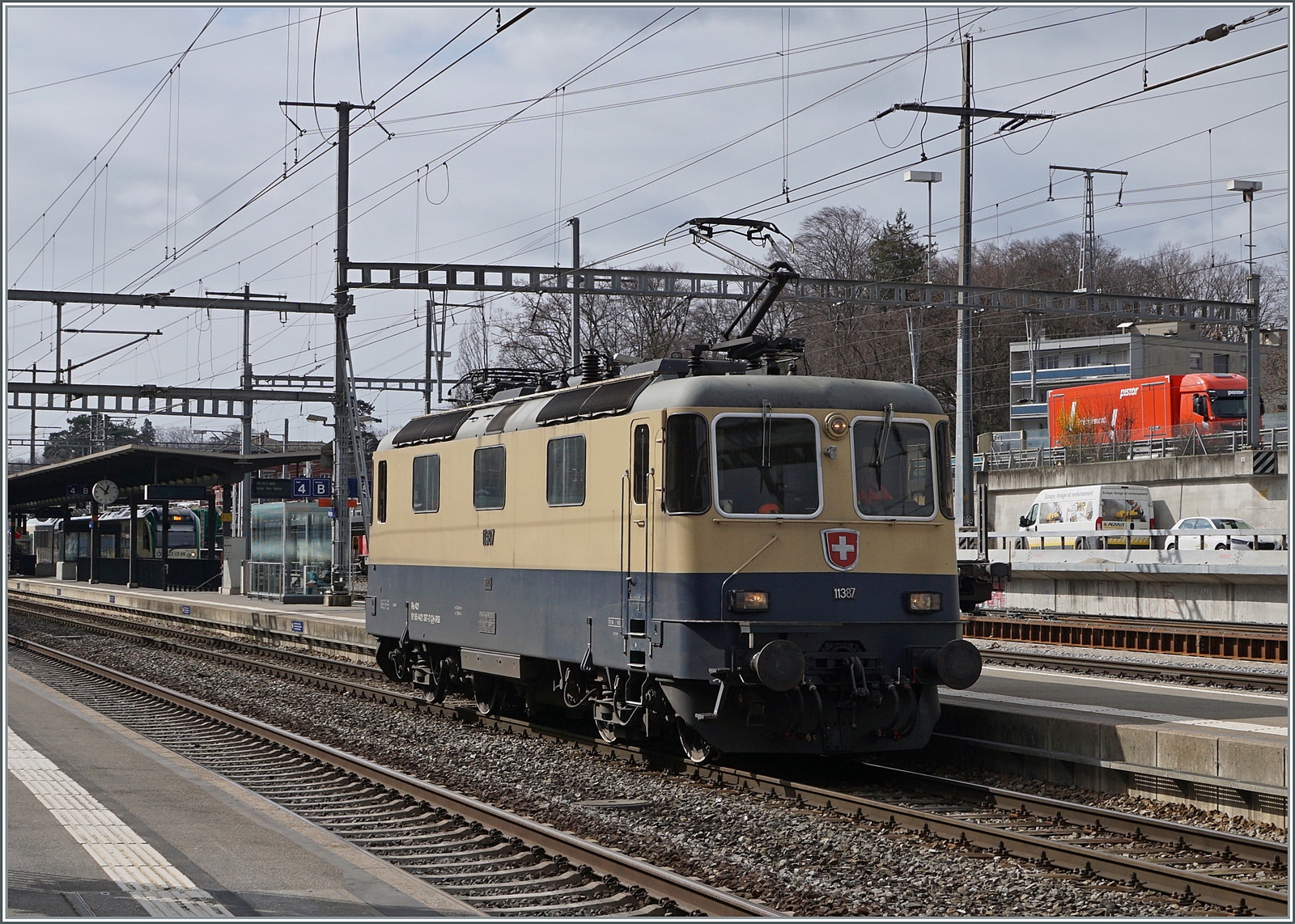 Tm III N° 147 der BAM zieht die mit Zuckerrüben beladenen Eaos von der Rollbockanlage aufs Normalspurgleis.