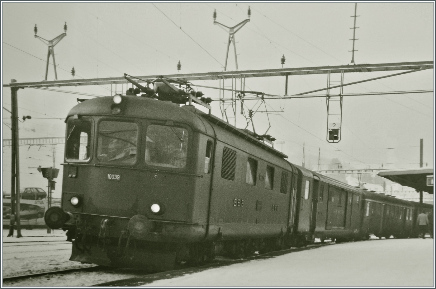 Eine Re 4/4 I fährt im Mai 1980 mit einem Personenzug aus Delemont im Bahnhof Moutier ein