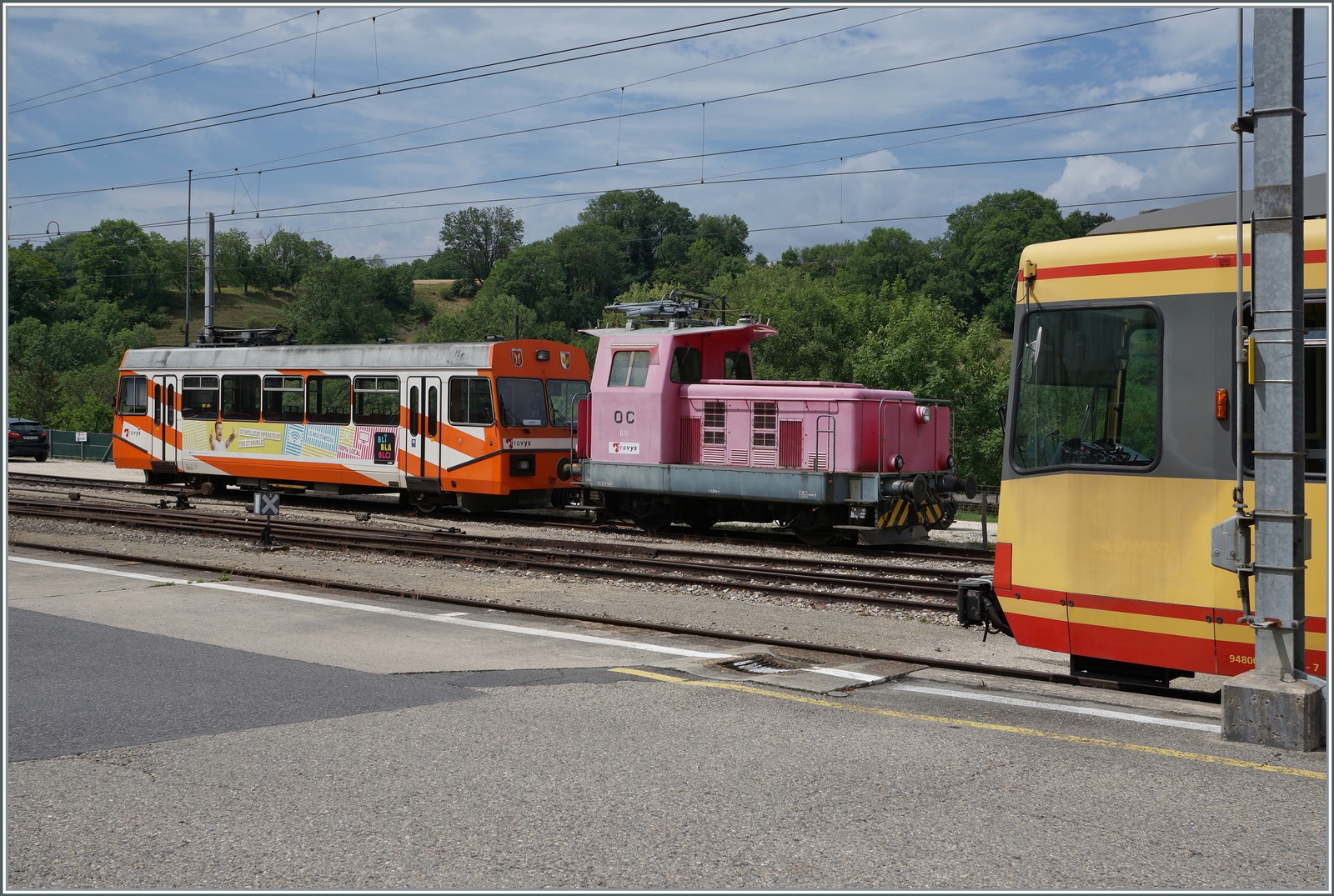 Bahnhof Orbe mit dem defekten Stadler Be 2/2 N° 14 (links im Bild) und dem dafür erworbenen Be 4/8 004 als Regionalzug 26945 nach Chavornay. Ein weiterer Be 4/8 stehet als Reserve im Hintergrund, so das künftig die OC wieder einen zuverlässigen Bahnverkehr anbieten kann.