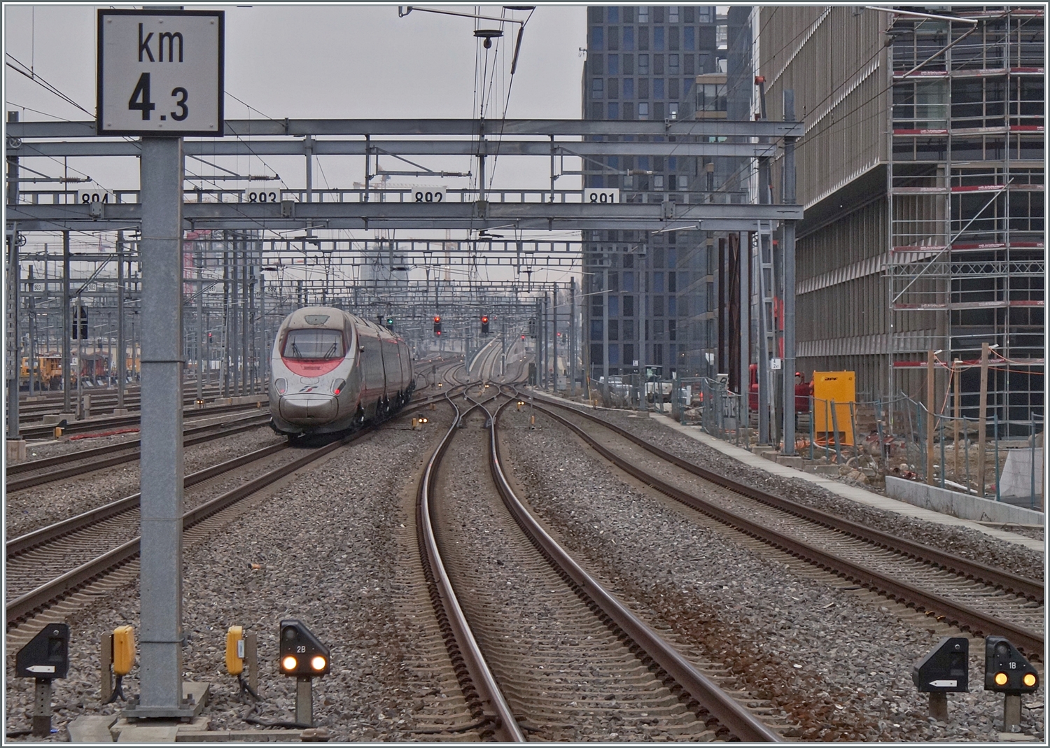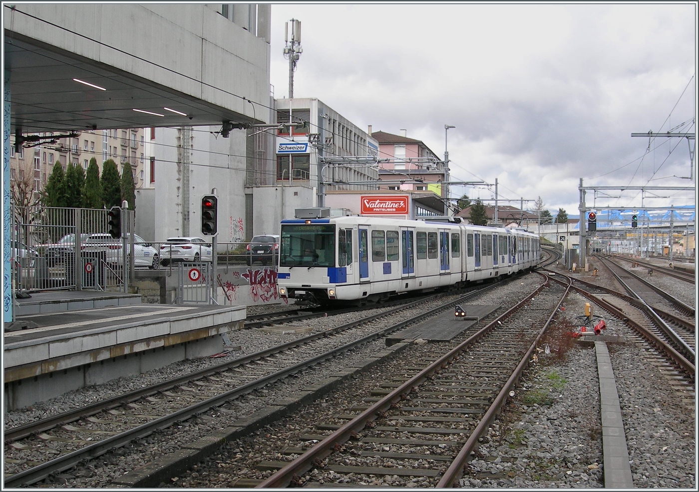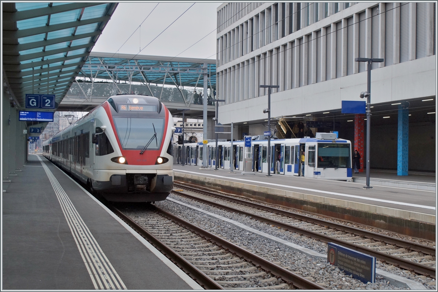 Zwei SBB Flirt, davon je ein RABe 523 und RABe 523.1 verlassen Renens nach Vallorbe und Le Brassus (Flügelzug). Im Hintergrund rechts im Bild ist ein TL TSOL Be 4/6 als m1 zu erkennen.