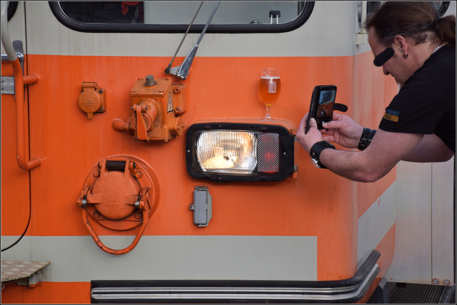 Bierlisi statt Bipperlisi. Als Bierstehtisch eignet sich Be 4/4 104 tatsächlich auch. Das passende Bild zur Bierlisi-Fahrt muss auch noch ins Handy... oder ins Netz. Solothurn, Februar 2026.