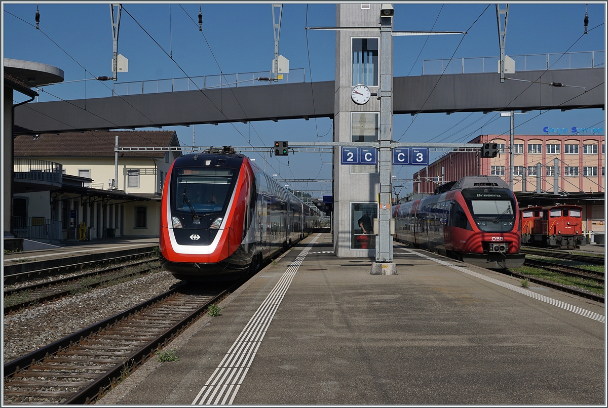 Zitat: "Nicht trivial für den Fotografen, während der Coronakrise Fotos im jeweiligen Nachbarland zu schiessen, aber auch nicht völlig unmöglich." (Zitat Ende) , meint Olli, und da gebe ich ihm recht; als weitere Lösung bietet es sich an die "ausländischen" Fahrzeuge im eigenen Land zu fotografieren. Hier drei Beispiele: Der ÖBB ET 4024 126-7 wartet in St. Margrethen auf die Abfahrt nach Bregenz.