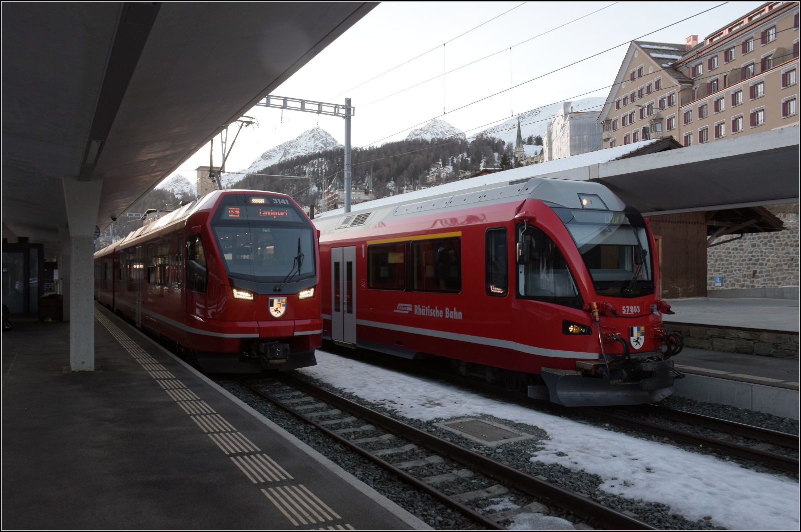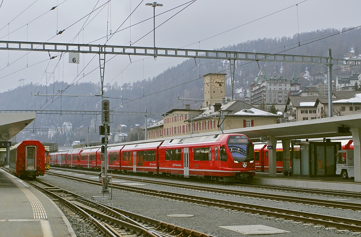 In St. Moritz stehen die beiden Capricörner ABe 4/12 3141 und ABe 4/12 3131 zur Fahrt nach Landquart via Unterengadin bereit. Daneben der Allegra ABe 8/12 3513 zur Fahrt nach Chur. Januar 2023.