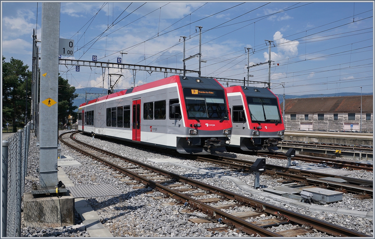 Im Bild steht ein GTW ABe 2/6 in Yverdon, während im Hintergrund ein SBB RABe 523 in den Bahnhof einfährt.