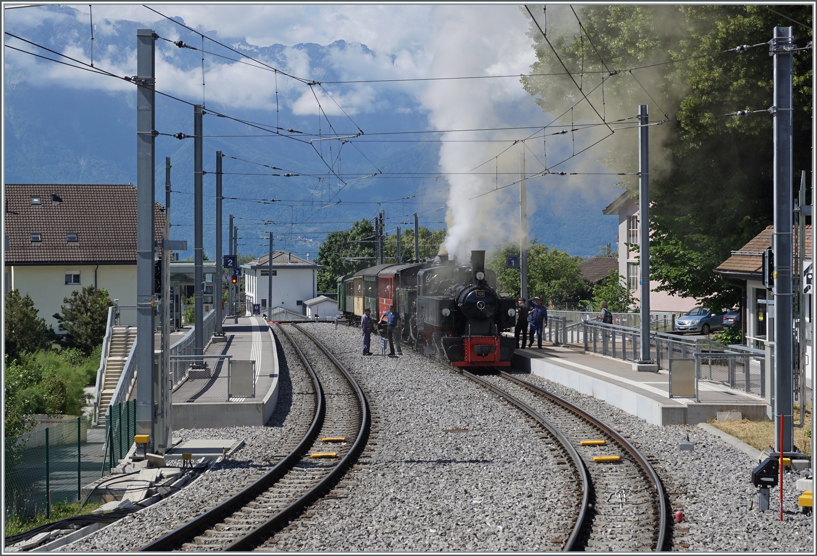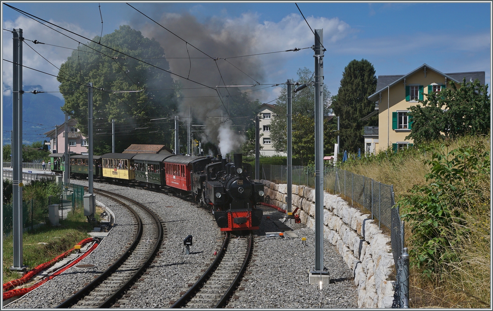 "Festival Suisse de la Vapeur 2022 / Schweizer Dampffestival 2022" der Blonay-Chamby Bahn: Kurz darauf erreicht die HGe 3/4 N° 3 ist mit ihrem Zug von Blonay den Museumsbahnhof Chaulin. Links im Bild die G 2/2 N° 4 "Rimini".