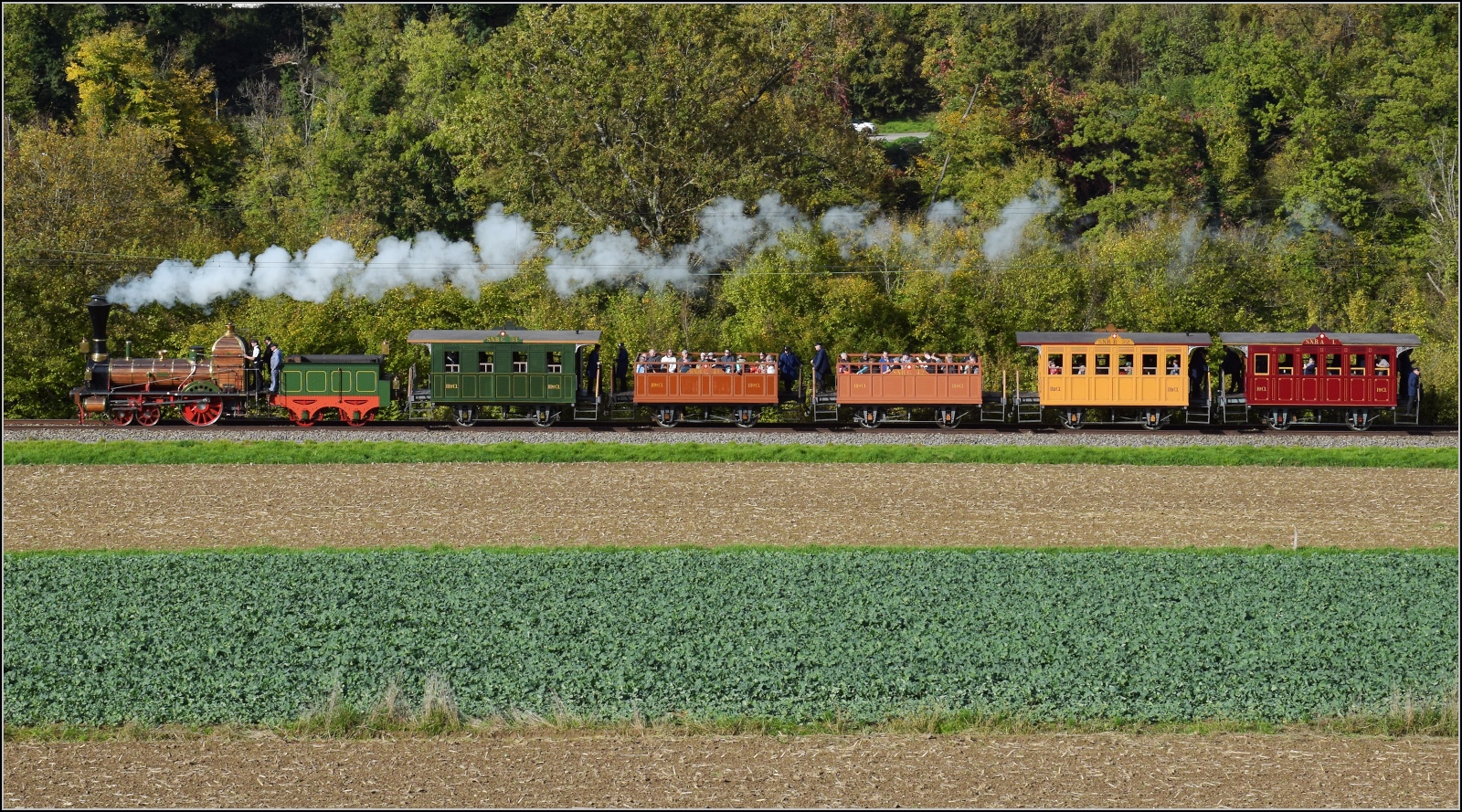 175 Jahre Spanisch-Brötli-Bahn. Entlang der N13 bei Schwaderloch. Im Hintergrund ist der Hotzenwald, südlichster Ausläufer des Schwarzwalds. Oktober 2022.