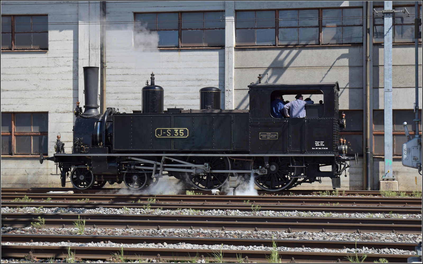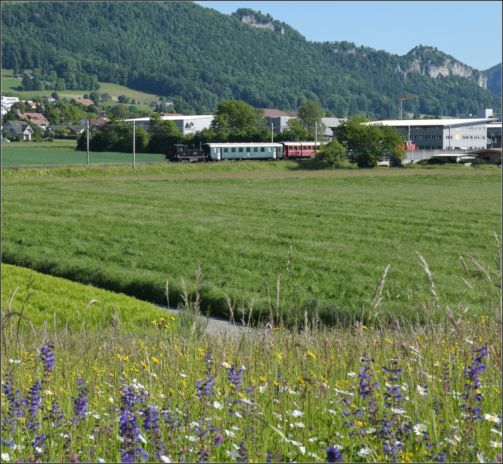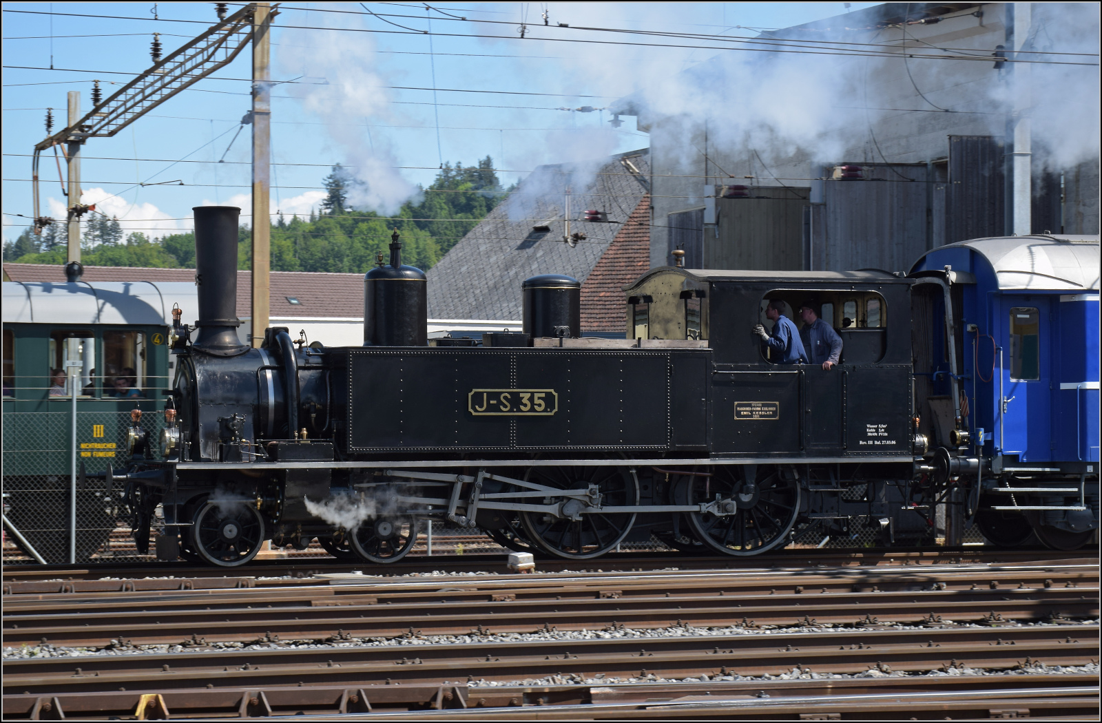 Eb 2/4 35 der Jura-Simplon fährt auf dem Weg nach Burgdorf durch Gerlafingen am Stahlwerk vorbei, einem Einnahmengaranten der Emmentalbahn und genaugenommen Keimzelle, denn von hier gingen die ersten Gleise einer Pferdebahn die Emme entlang nach Derendingen. Mai 2025.
