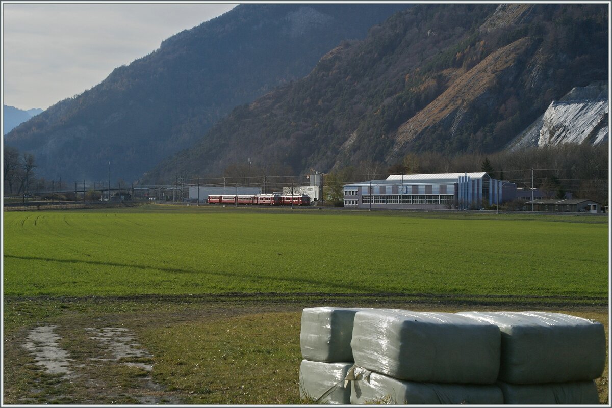 Der RhB Be 4/4 513 erreicht, auf dem Weg von Thusis nach Schiers, den Vorortsbahnhof Chur Wiesental.