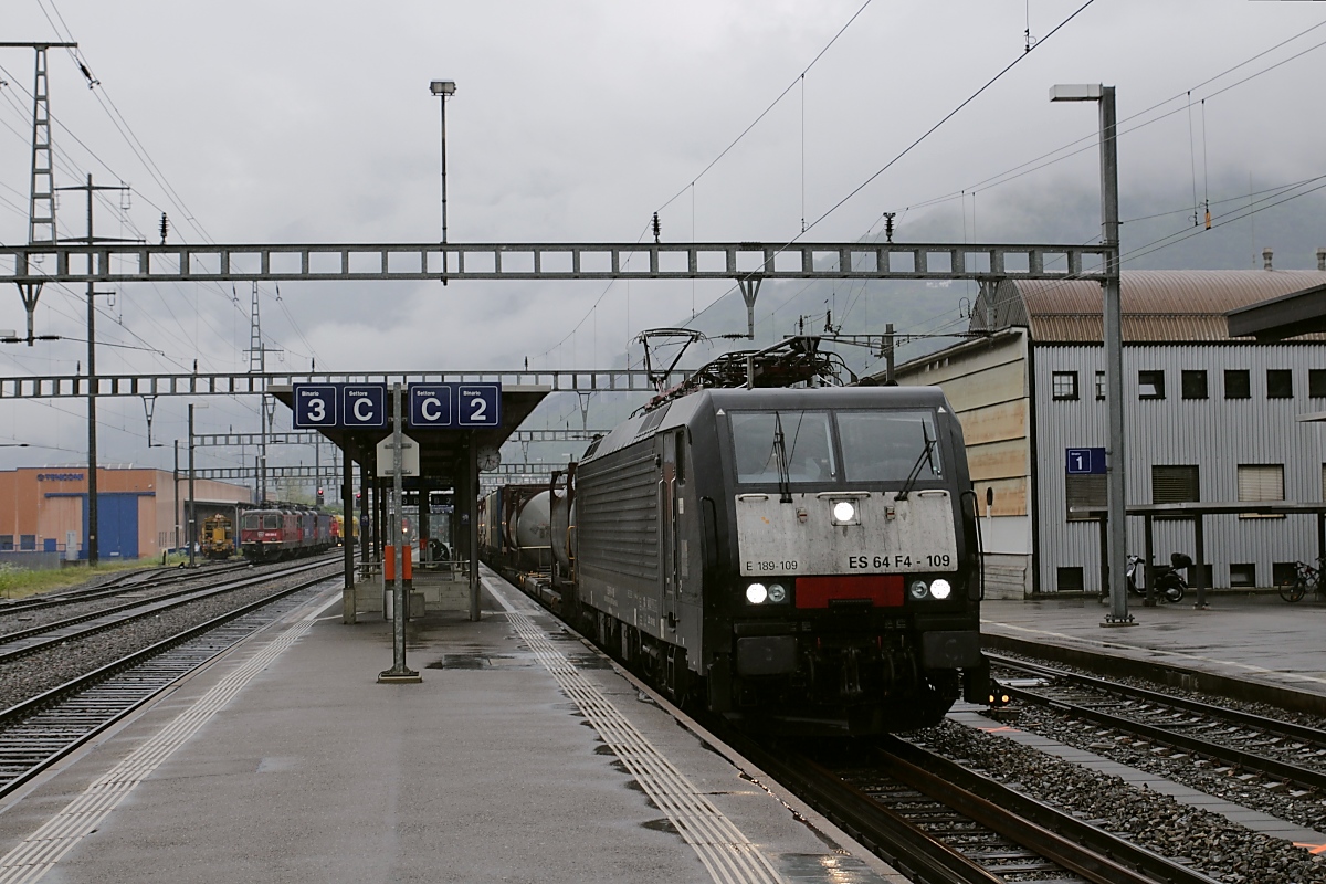 Abwechslungsreiche 17 Minuten in Cadenazzo: Um 17.43 Uhr liefern sich 474 002 und Am 843 088-6 ein Wettrennen, das klar zugunsten der 474 ausging (08.05.2019)