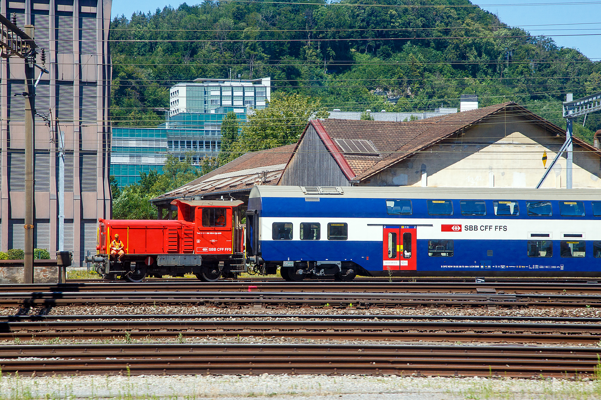 Die schmalspurige BAM MBC besitzt zunehmend Normalspurfahrzeuge, neben der Re 4/4 II 506, und Te 212 sowie einem Tem nun auch diesen Tm 232 134 (98 85 5232 134-7 CH-MBC) der im Kieswerk in Gland für Rangieraufgaben benötigt wird.