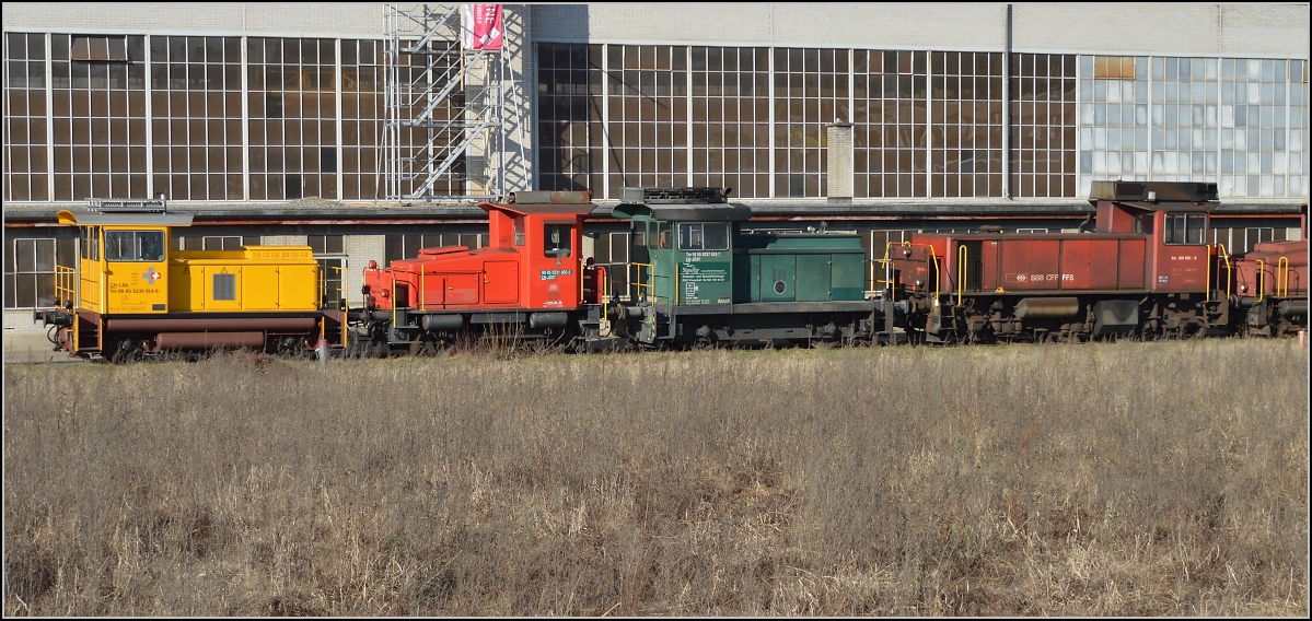 Traktorensammlung bei der Firma Stauffer in Frauenfeld. Februar 2014. Tm 236 914-8, Tm 231 003-5, Tm 237 933-7 und Em 831 001-3 geben zur Straße hin ein buntes Bild ab. Olli