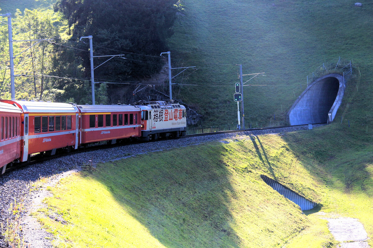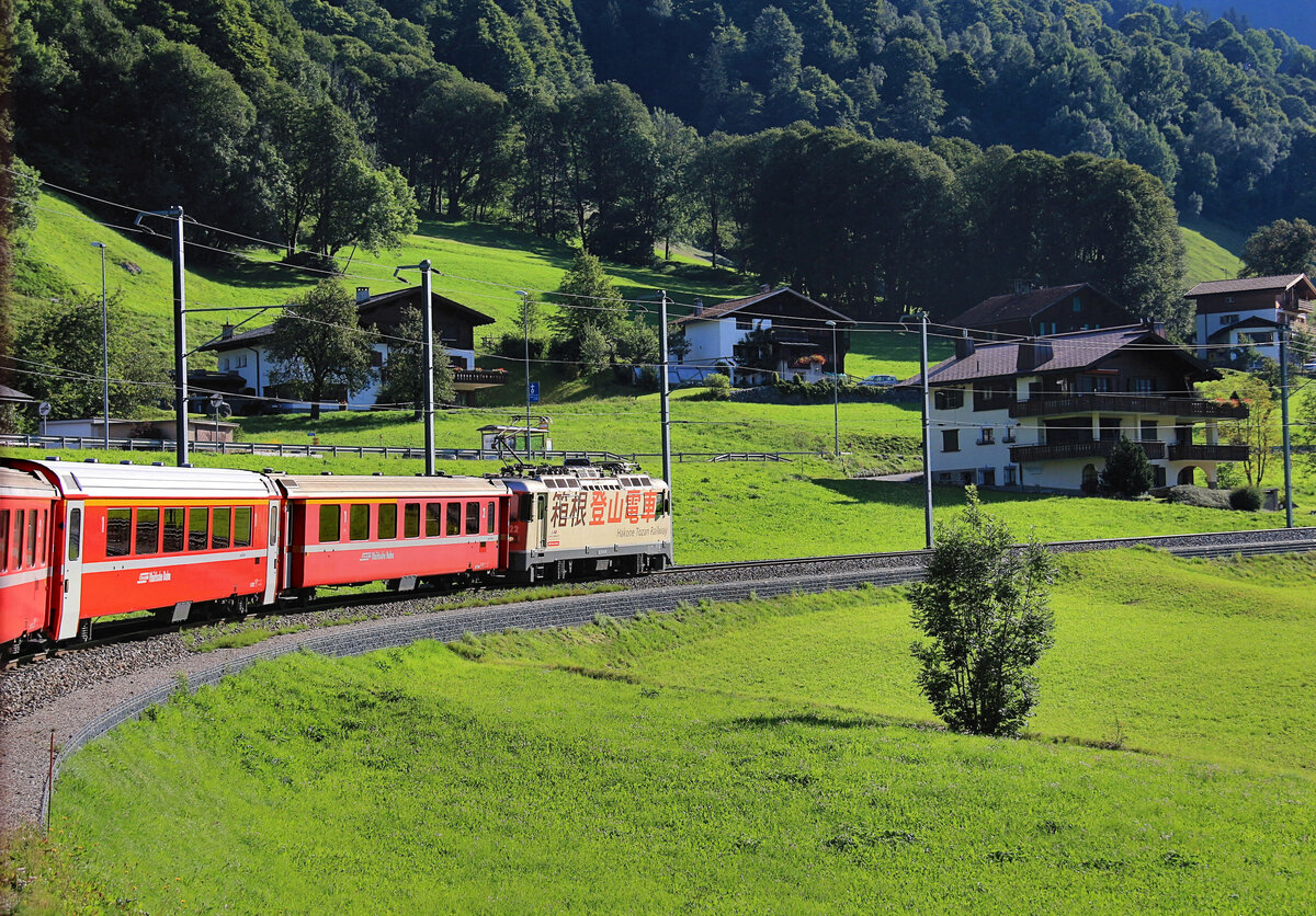 Die Gestaltung der Ge 4/4 II 622 "Arosa" weist auf die japanischen Partnerbahn Hakone Tozan Tetsudō hin. Die Aufnahme entstand am 30.03.2022 in Samedan.