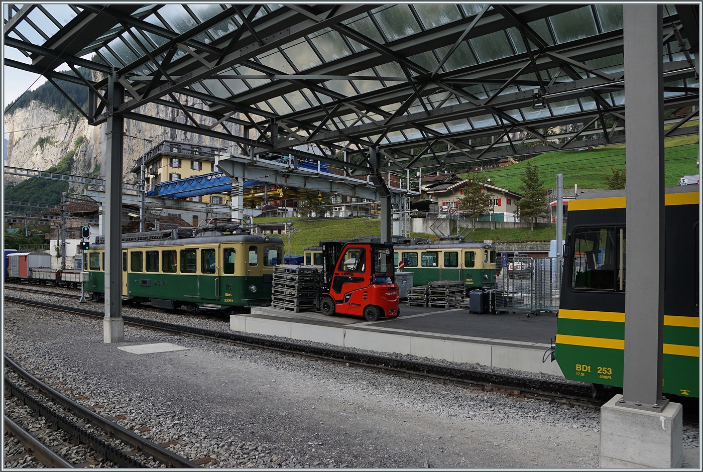 Ein Blick auf den WAB Güterumschlagplatz von Lauterbrunnen mit dem WAB BDeh 4/4 115 beim Güterschuppen und des etwas verdeckten He 2/2 32.