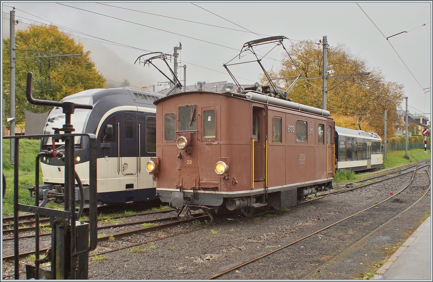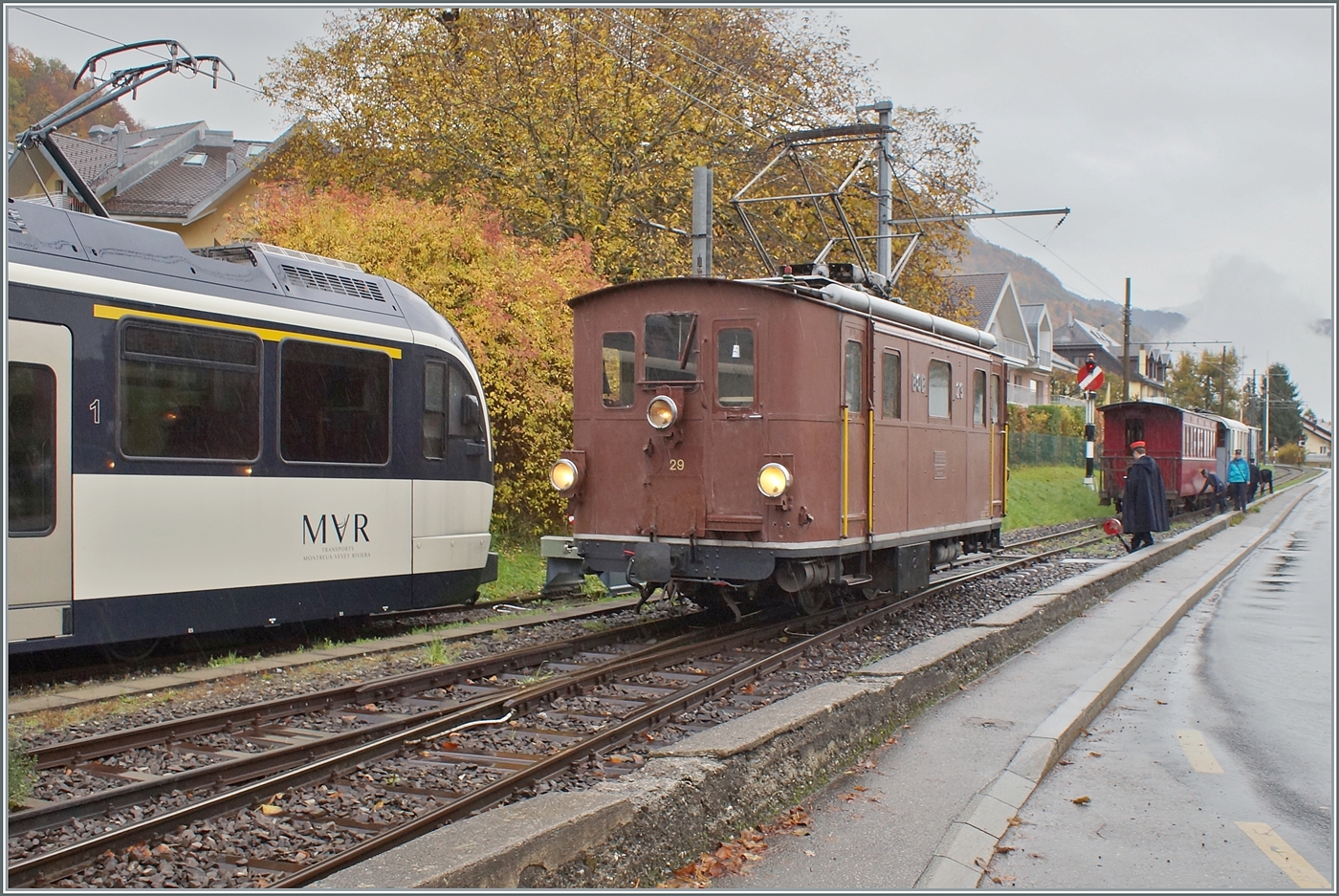 Nostalgie & Vapeur 2021 (Pfingstfestival) - Die Blonay-Chamby Bahn BOB HGe 3/3 29 ist mit einem Personenzug von Blonay nach Chaulin unterwegs und erreicht in Kürze Chamby