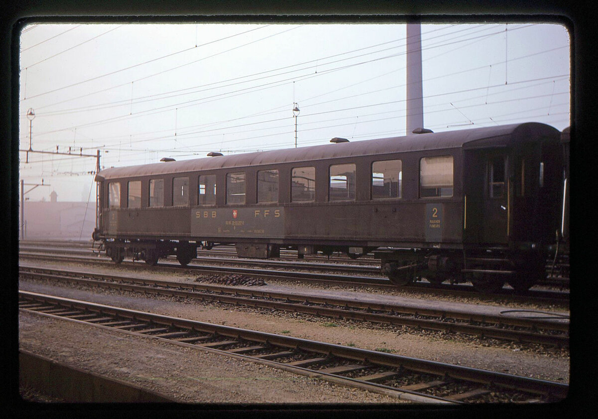 SBB Altbauwagen: Einfahrt in Genève eines Zuges mit Ae3/6 I-110 10692. An erster Stelle ein Altbauwagen, wahrscheinlich ein geschweisster Wagen Serie 7664...7699 (20-03 262...297) von 1932-1935. 13.Juli 1965