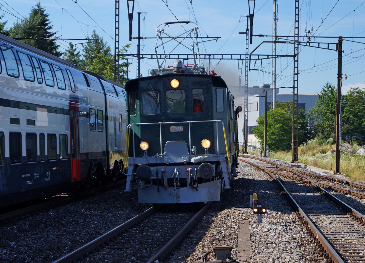BDWM/DVZO/DBB: Ueber das Wochenende vom 26. bis 28. Juni 2015 verabschiedete sich die BDWM nach 140 Jahren vom Anschluss an das Europäische Normalspurnetz, weil durch die Aufhebung des Güterverkehrs auf normaler und schmaler Spur das Dreischienengeleise zwischen Wohlen und Bremgarten West nutzlos geworden ist. Mit dem WESCHTFÄSCHT und vielen Sonderfahrten nahmen Schüler und eine grosse Anzahl Festbesucher Abschied vom Dreischienengeleise auf diesem reizenden Streckenabschnitt. Am 26. Juni 2015 brachte die DVZO Be 4/4 15, ehemals BT die DBB Eb 3/5 5810 "HABERSACK", ehemals SBB von Konolfingen nach Wohlen. Die Aufnahme dieser Ueberfuhr ist bei Herzogenbuchsee, leider auf dem nicht vorgesehenen Geleise entstanden.