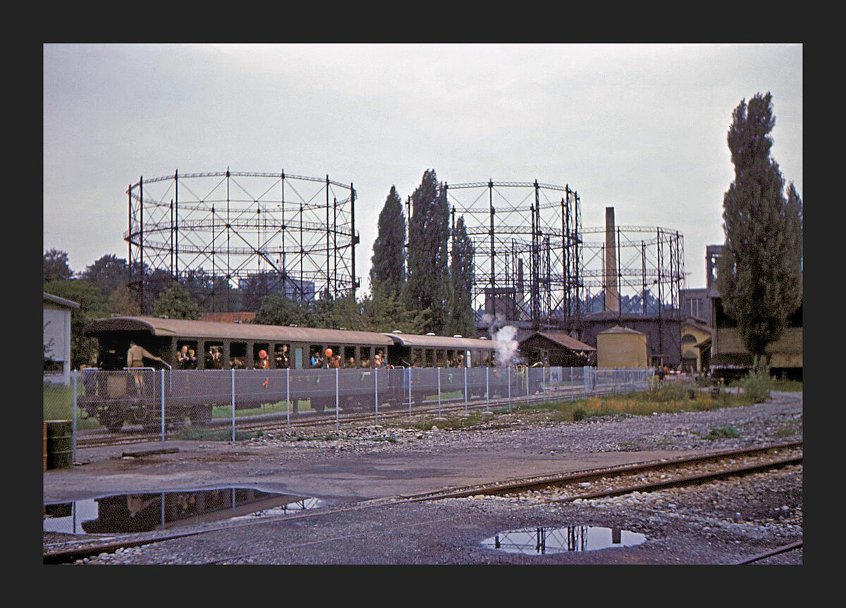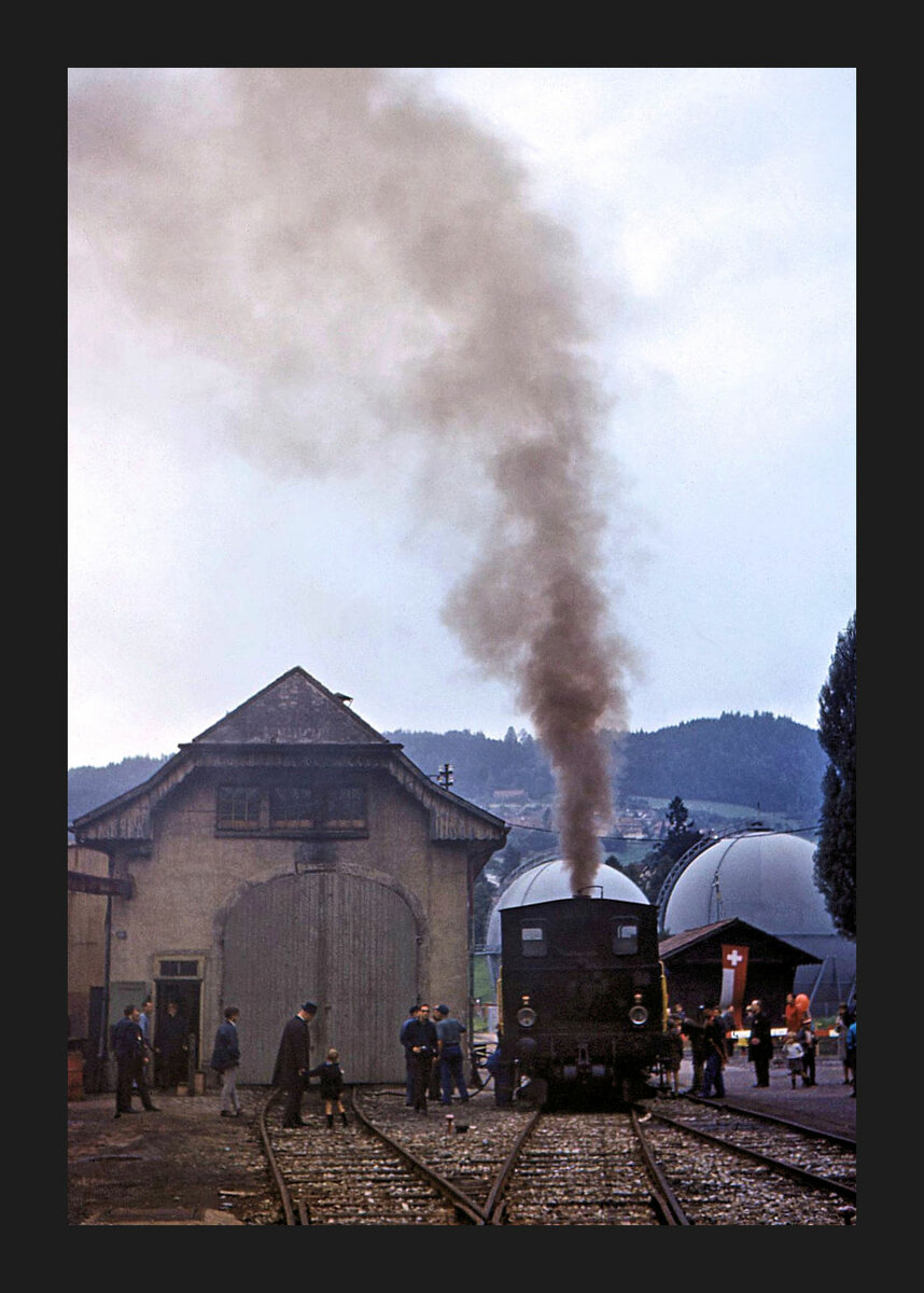 Am 8.März 1967 herrscht in Wabern ein erstaunlicher Güterverkehr. Vorne steht Ce 4/4 311 mit einem Güterzug der Gürbetallinie; der erste Wagen ist ein uralter BLS Drehgestellwagen (B 855?). Links daneben steht der Em 2/2 "Mutz" der Gaswerkbahn Bern, im Schlepp Kesselwagen für die damaligen Bitumen (und Erdöl?)-Verarbeitungsindustrien entlang der Bahnstrecke, bevor diese dann in die steile Steigung hinunter zum Gaswerk einbiegt.