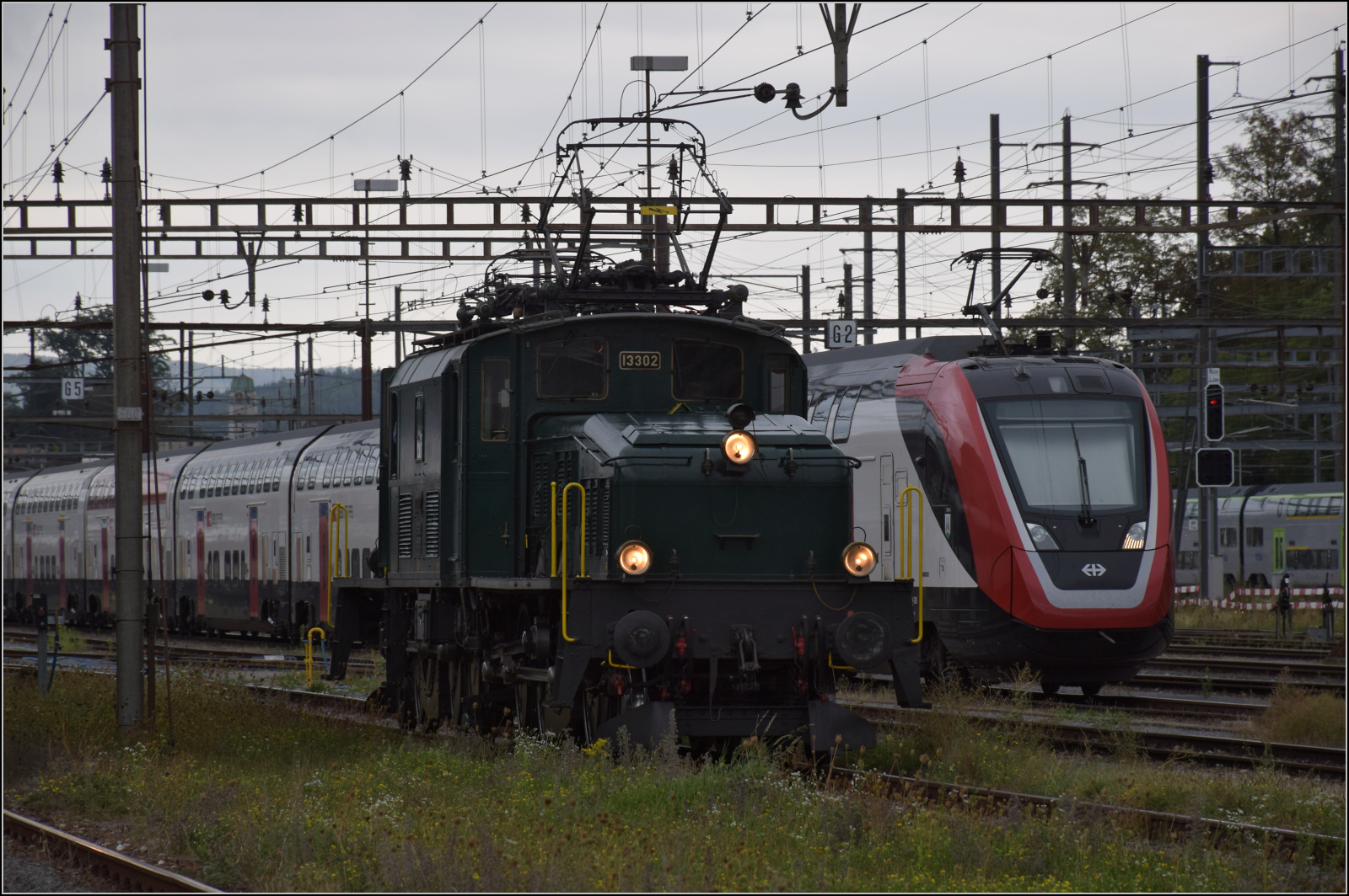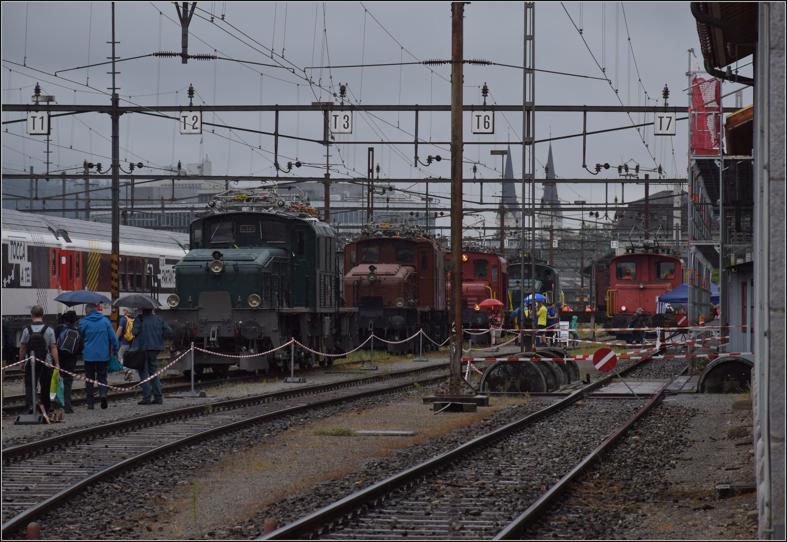 In stromender Regen steht SBB Historic 14253 in Erstfeld am 19 September 2021 abfahrtbereit mit eine der Stundlich fahrende Pendelzüge Erstfeld<=>Göschenen während der Erstedition der Gotthard Bahntage.
