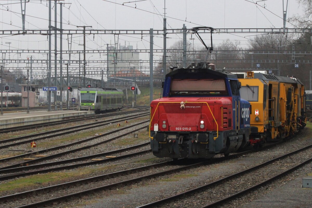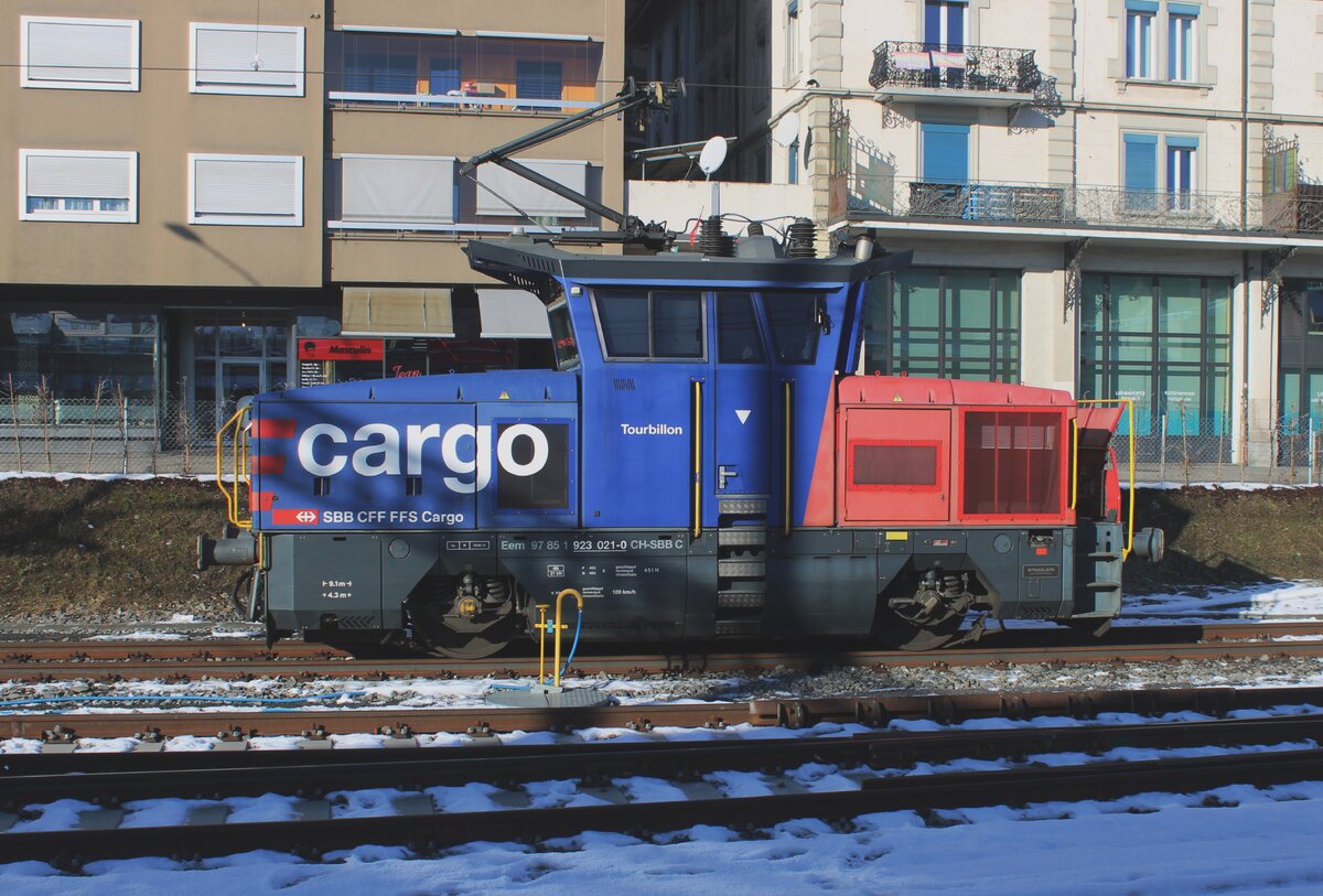 Die kleine Stadler SBB Cargo Eem 923 007-9 kümmert sich in Vevey um den grossen Bombardier RABe 502 Twindexx.