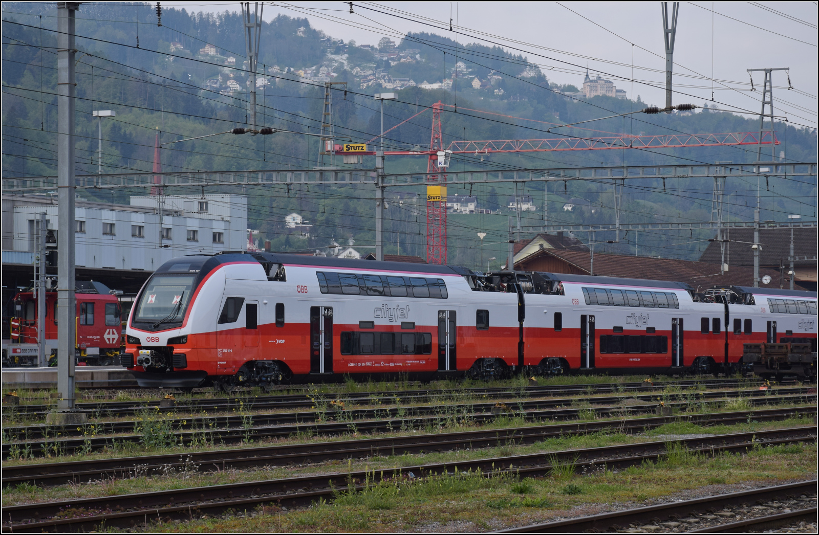 Rollout des ersten Kiss für die ÖBB. Und dann ging es recht schnell für 4734 101 auf die Reise ins Stadler Inbetriebsetzungszentrum Erlen, erst einmal durch den Bahnhof St. Margrethen. April 2024.