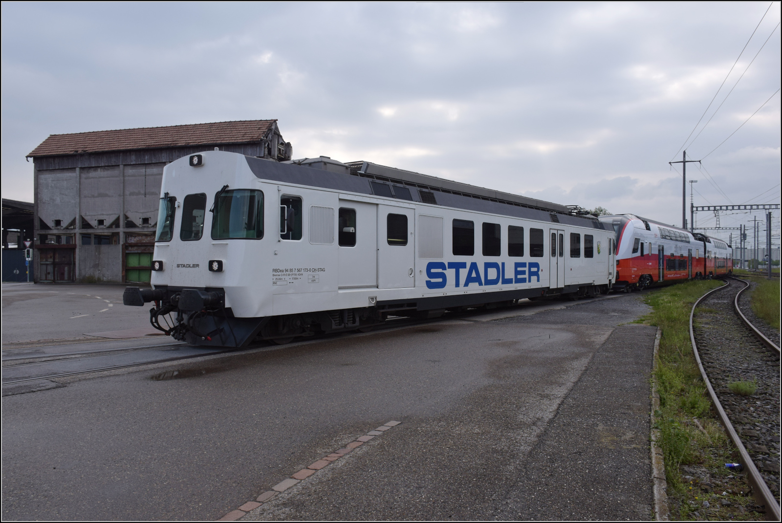 Rollout des ersten Kiss für die ÖBB. Als die Hürden geschafft sind, muss man schon aufpassen, dass sich der Kiss nicht gleich nach Österreich begibt, da fehlen nur ein paar Meter, wer genau hinschaut sieht bereits die Berge des Bregenzerwaldes. Für Schubkraft sorgt der nachgerüstete Akku am ehemaligen RVT-Triebwagen RBDea 567 173, der hauseigene Tm 232 bleibt an diesem Tag ohne Aufgabe. Elektrotriebzüge ohne Fahrdraht, das ist noch gewöhnungsbedürftig. St. Margrethen, April 2024.