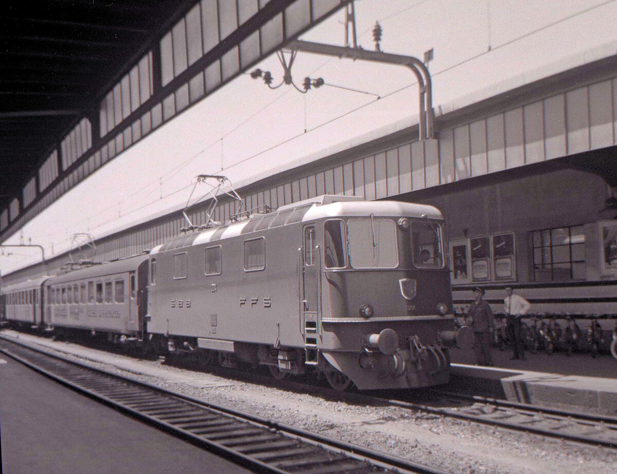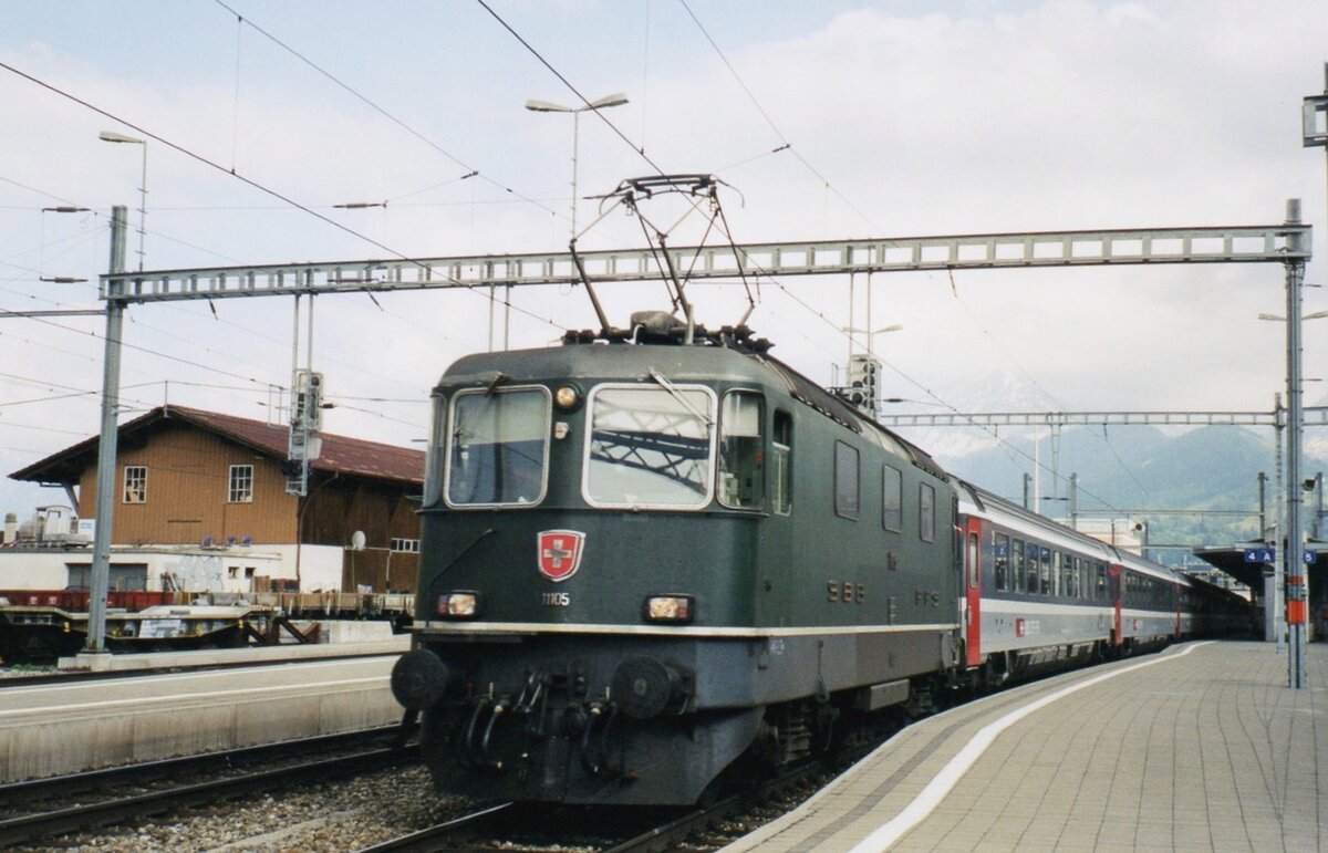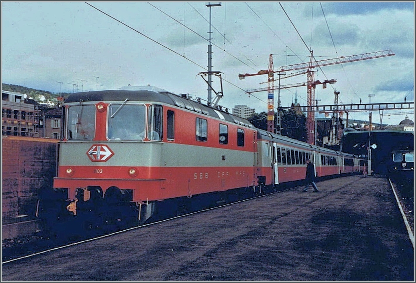 Noch eine Prototyp Re 4/4 II: Die SBB Re 4/4 11104 erreicht mit ihrem Schnellzug 1713 den Bahnhof von Aarau.