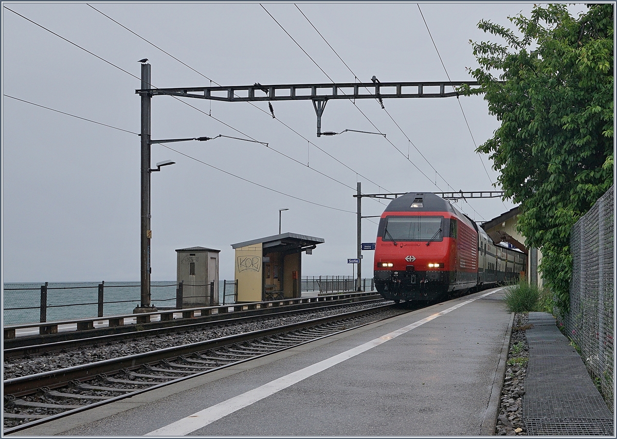 175 Jahre Schweizer Bahnen, und zum Jubiläum wurde neben einer Re 4/4 II auch diese SBB Re 460 019 mit einer Jubiläumsfolie beklebt. Die SBB Re 460 019 mit dem IR 90 1720 bei St-Saphorin.
