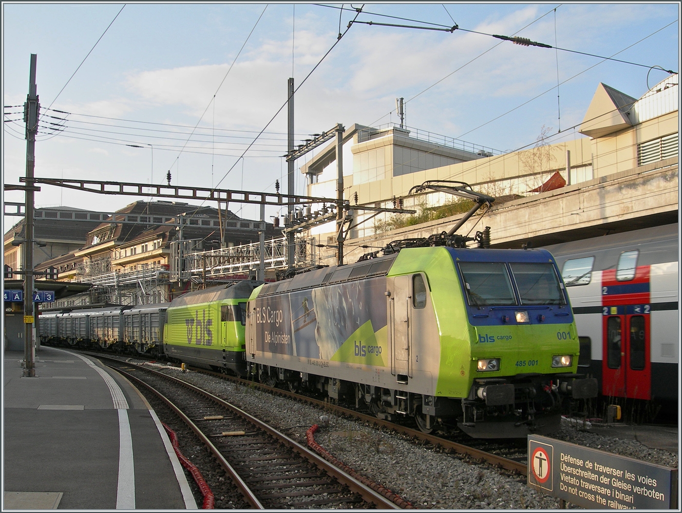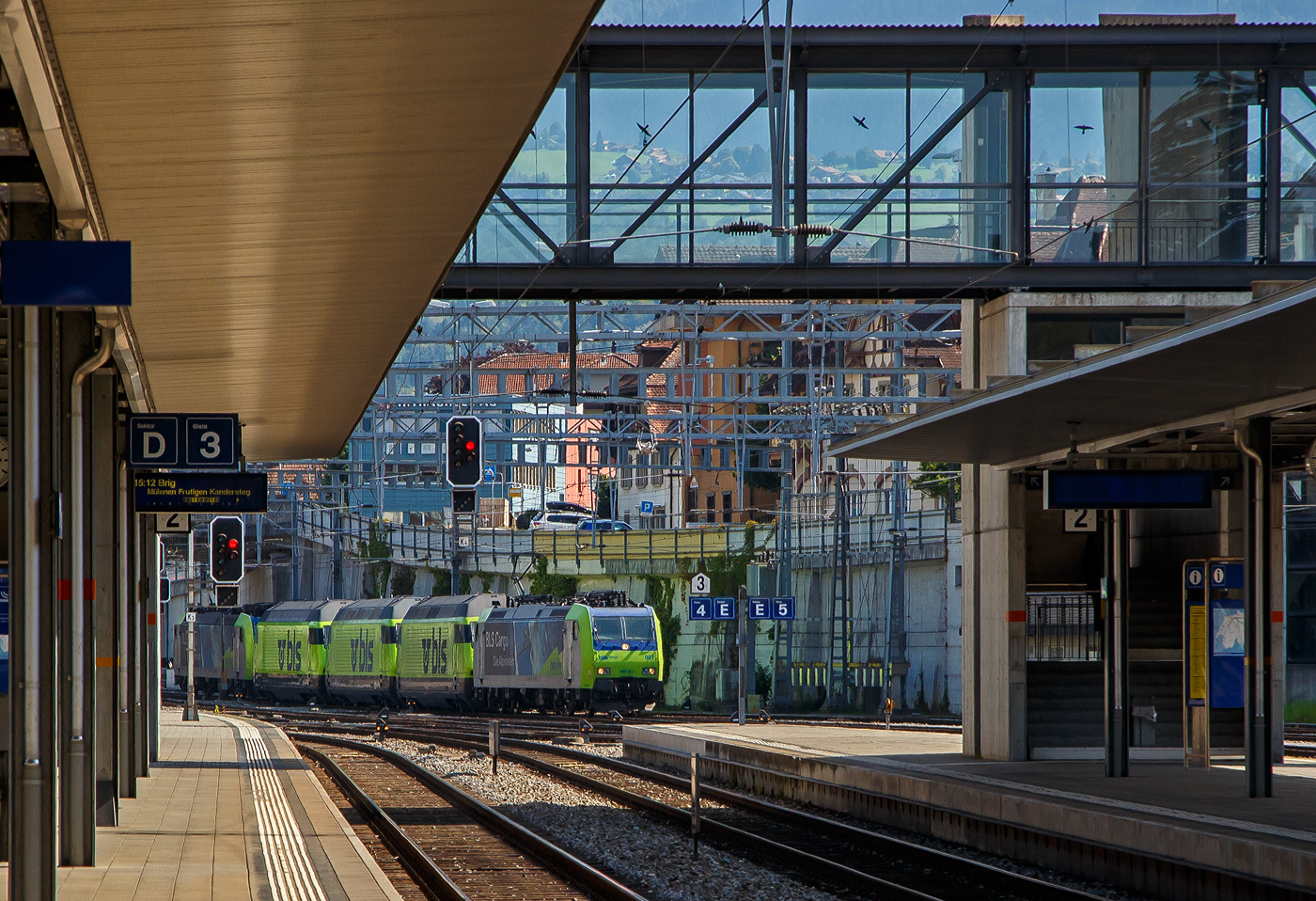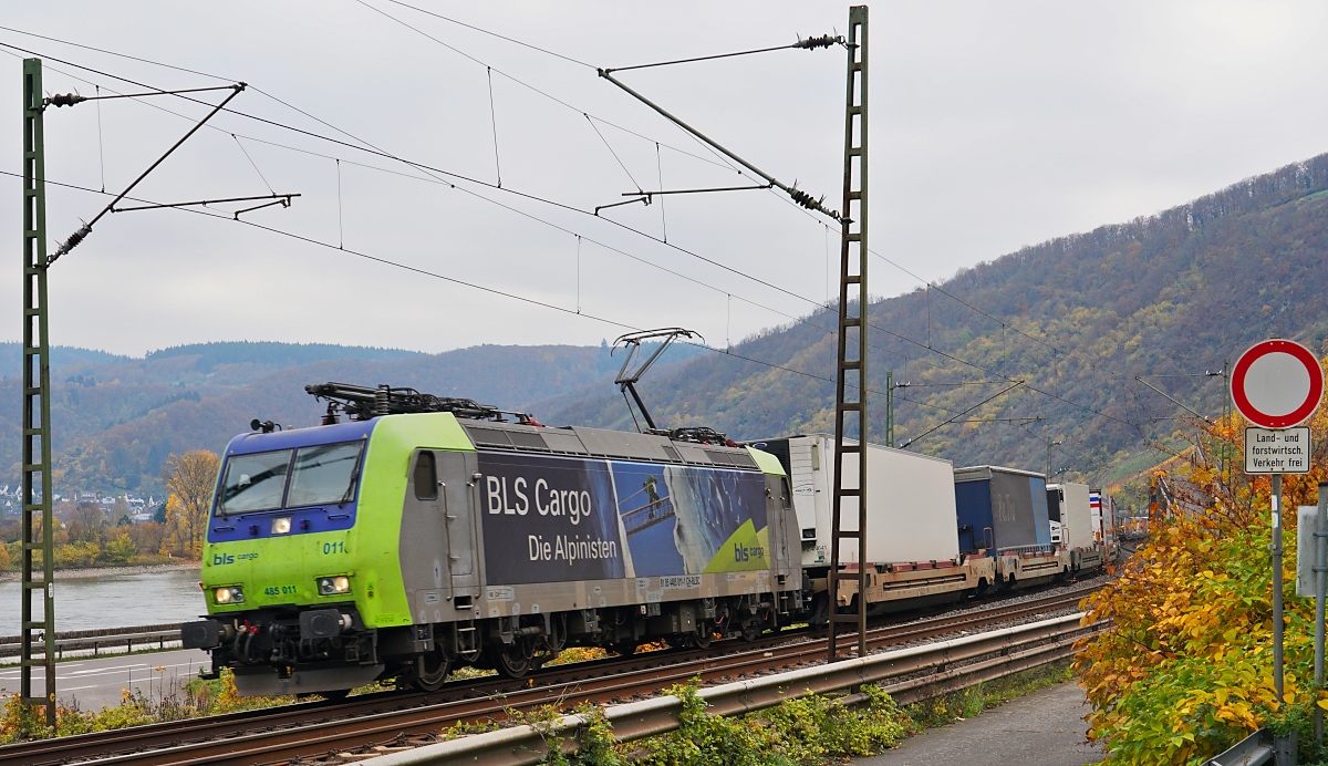 Etwas von der Vegetation verdeckt ist die BLS Re 485 014 mit einem Kesselwagenzug bei Ligerz auf der Fahrt Richtung Biel/Bienne.