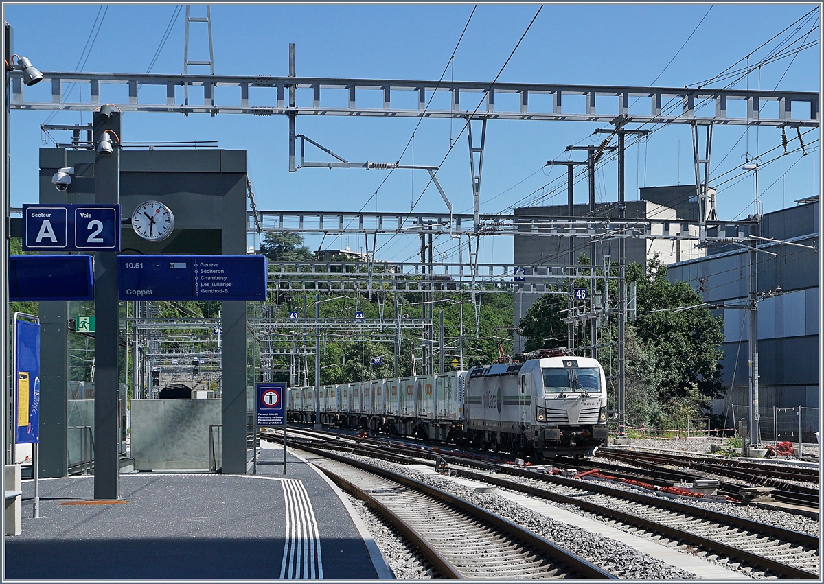 Die Rail Care Rem 476 454 (UIC 91 85 4476 454-9 CH-RLC) ist nach der Fahrt nach Vufflens la Ville mit ihrem Coop-Container-Zug wieder zurück in Genève, hier erreicht der Zug bei Lancy Pont-Rouge den Güterbahnhof Genève La Praille. 19. Juni 2018 Stefan Wohlfahrt